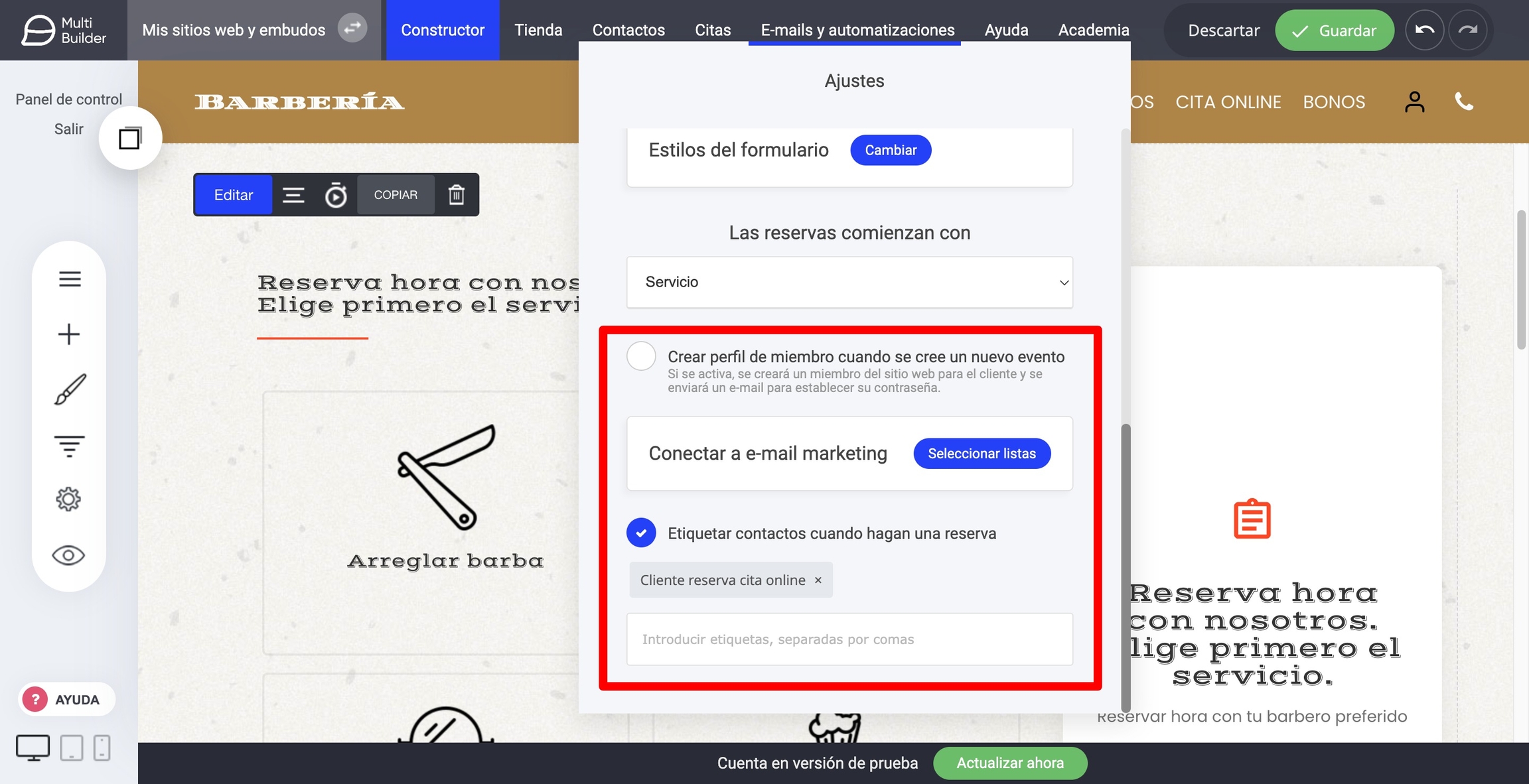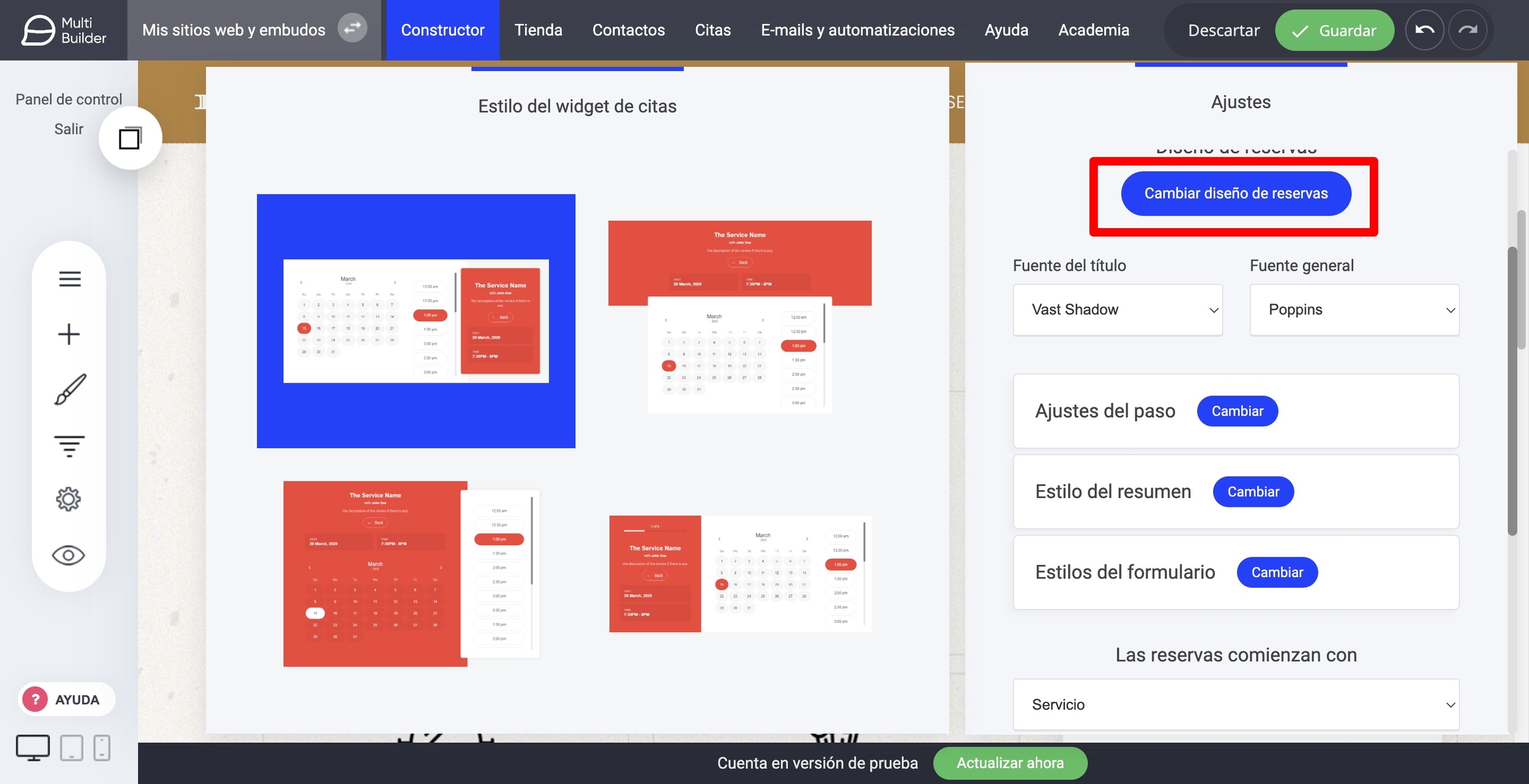Las reservas comienzan con: si tienes varios operadores y varios servicios, puedes ajustar la opción de empezar eligiendo primero el servicio o el operador.