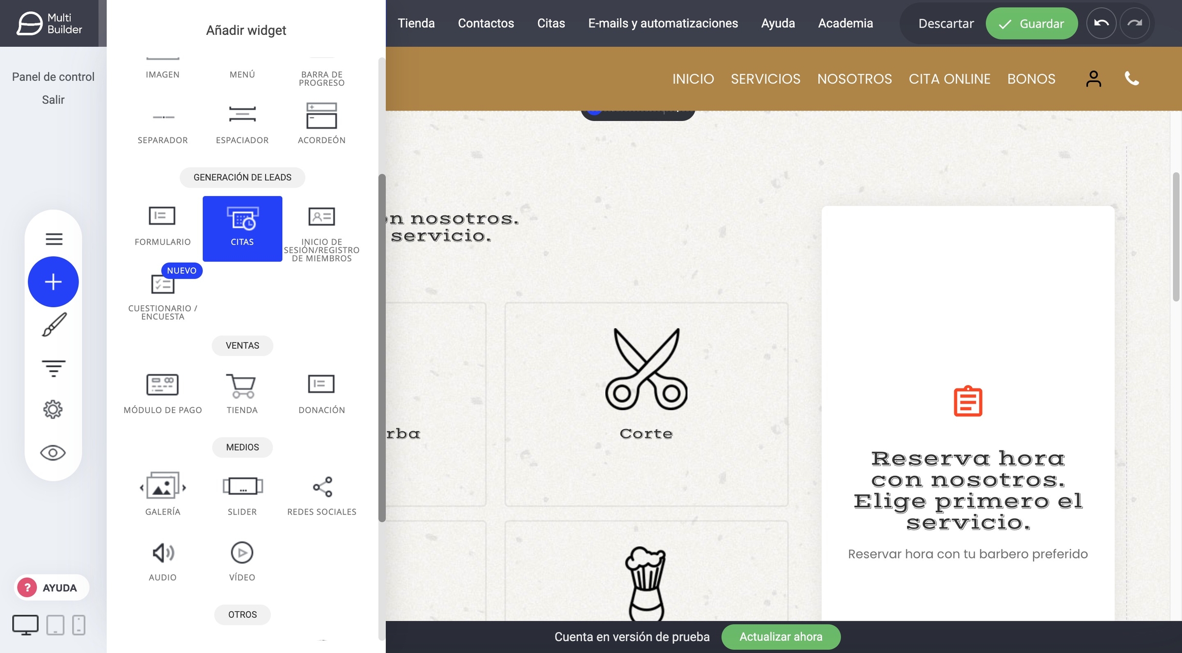 Para insertar un calendario de citas en nuestra web vamos a Añadir widget>Generación de leads>Citas.