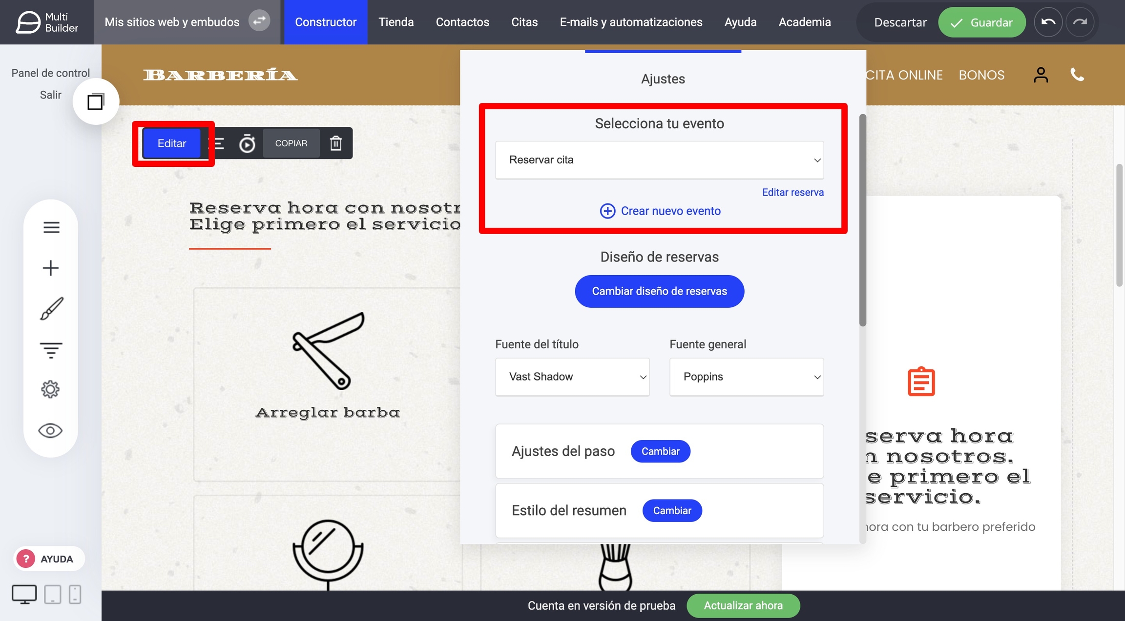 Como ya habremos configurado la reserva en la pestaña de Citas, ahora tenemos que elegir el evento que queramos mostrar. Desde aquí mismo puedes ir editar el evento o crear uno nuevo (esto te llevará directamente al menú superior de Citas)