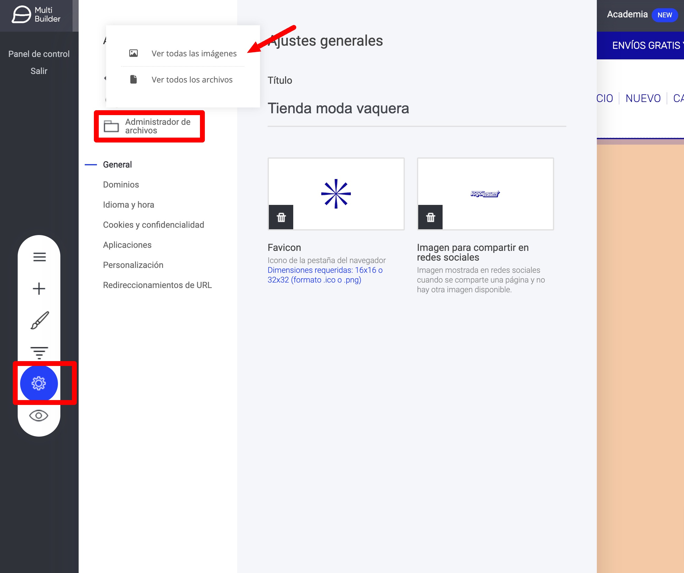 El administrador de archivos es donde se guardan todas tus imágenes y archivos. Se encuentra en Ajustes del sitio>Administrador de archivos.