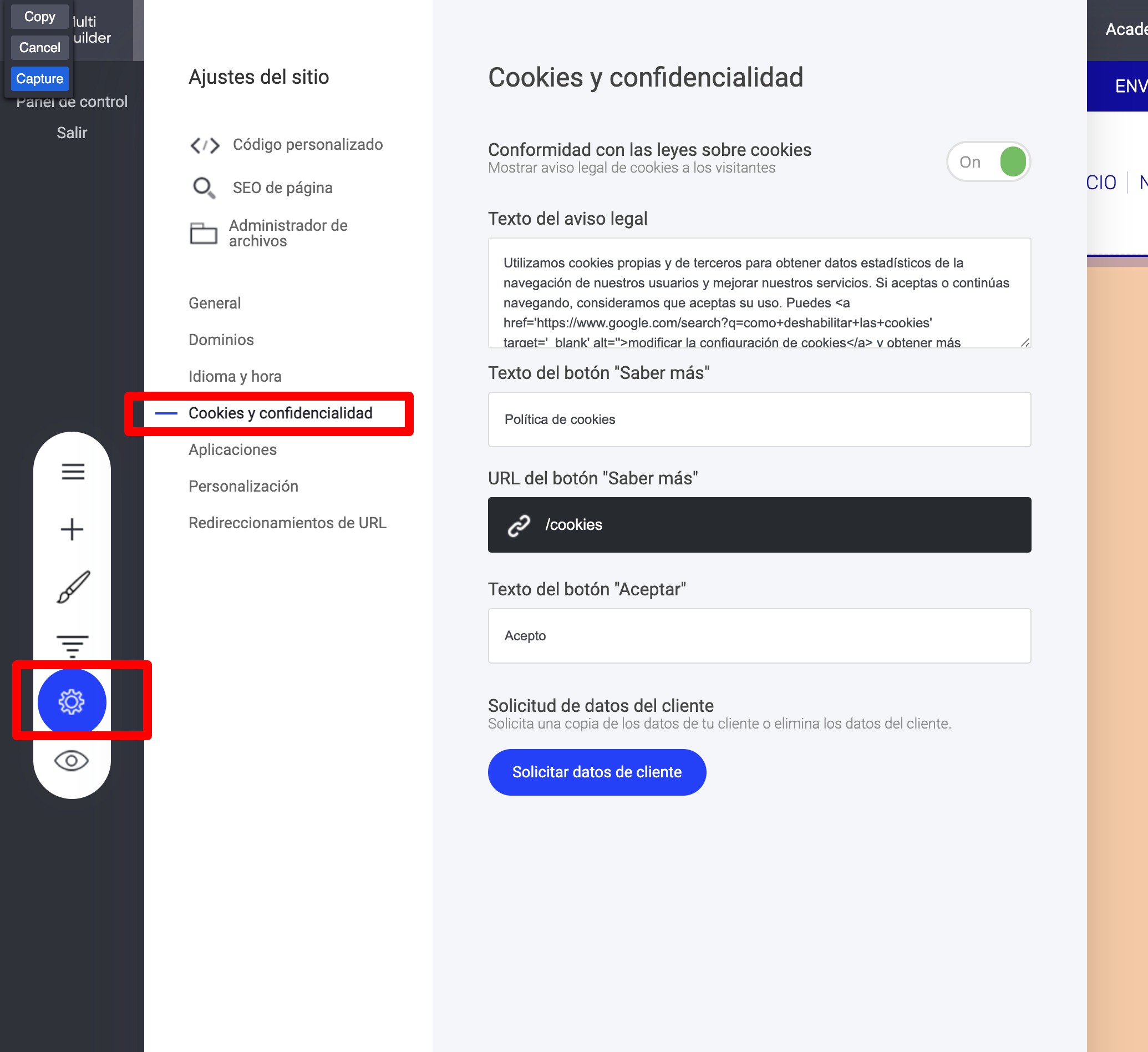 Desde Ajustes del sitio>Cookies y confidencialidad podrás configurar el banner que debe aparecer por normativa europea en todos los sitios web para cumplir con las leyes sobre el uso de cookies y protección de datos.