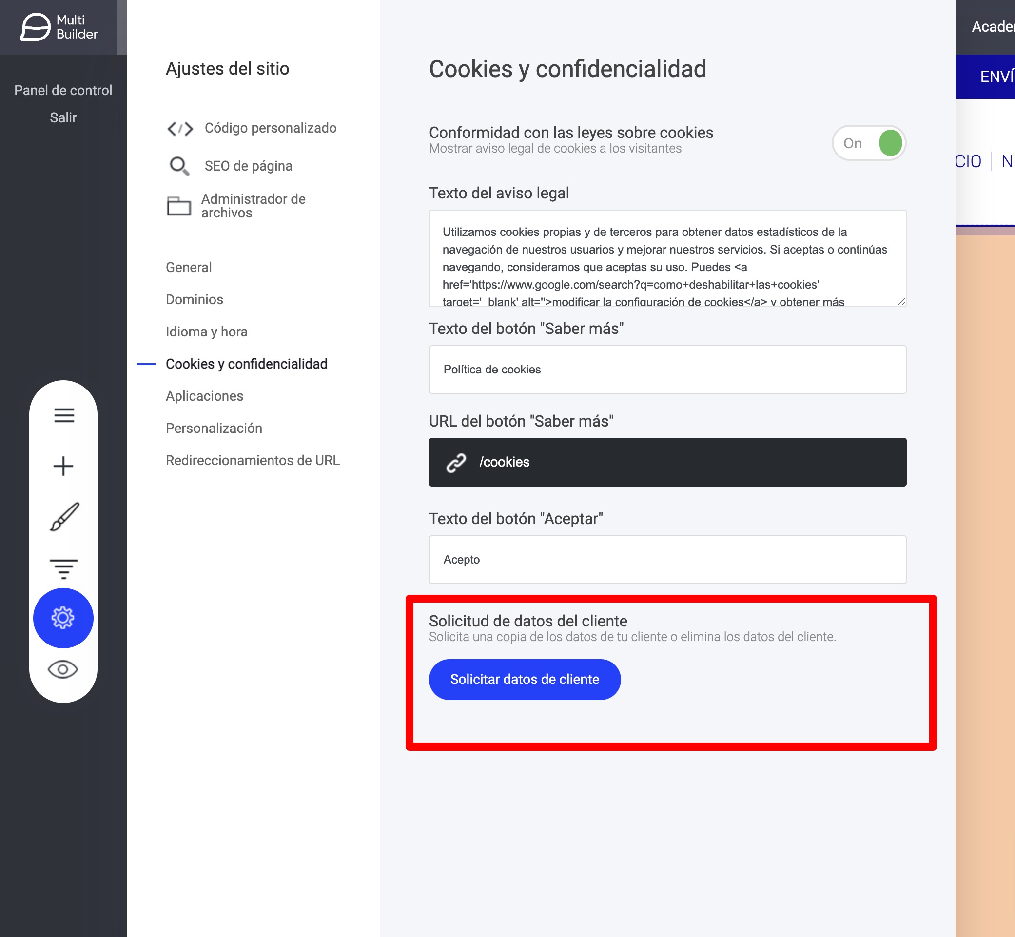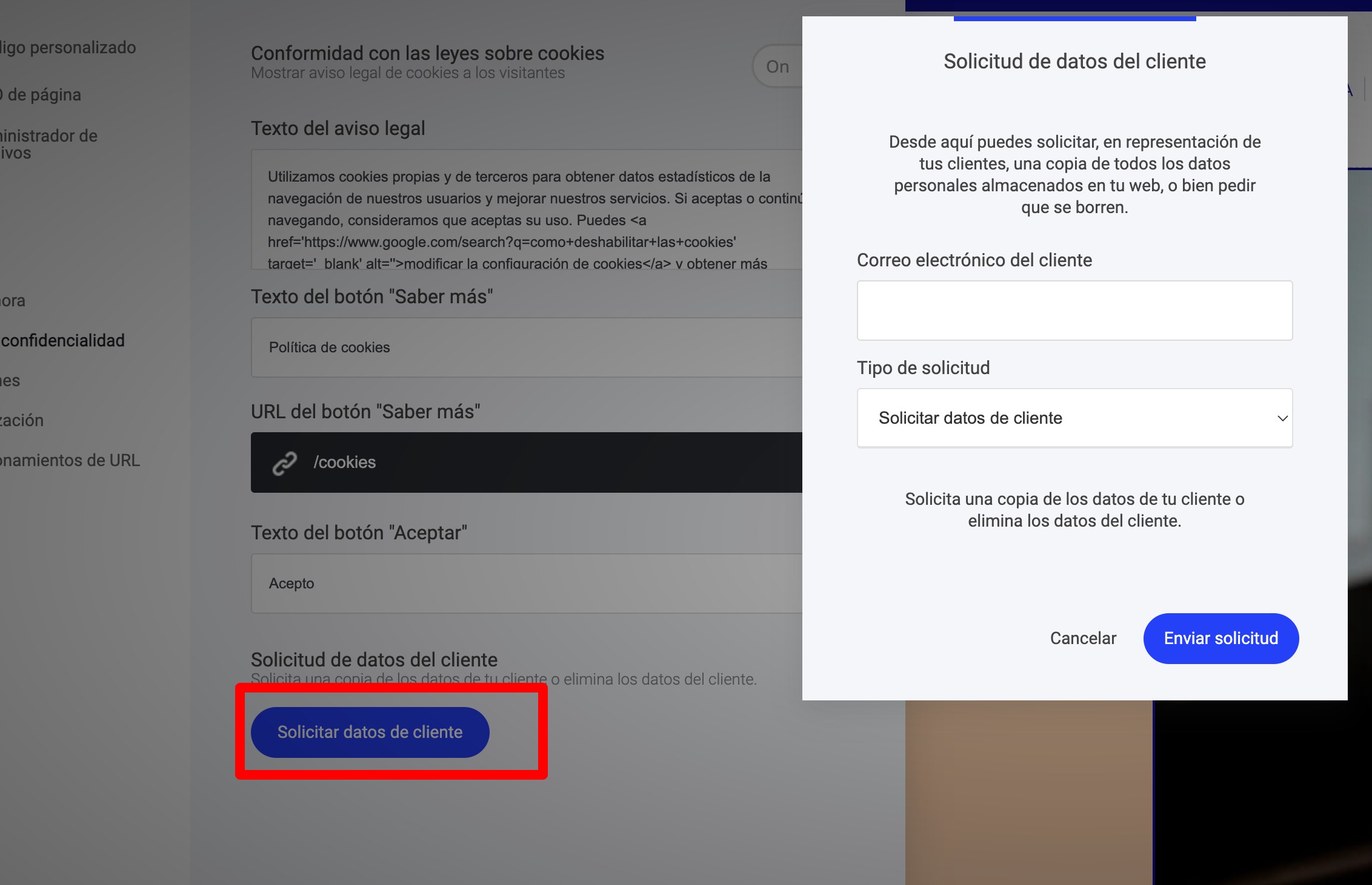 Para solicitar los datos personales disponibles que están almacenados en nuestros servidores, tienes que ir a Ajustes del Sitio > Cookies y confidencialidad > Solicitud de datos del cliente. En un plazo de 72 horas te enviaremos toda la información que tengamos sobre un cliente específico (identificado por su e-mail). Posteriormente, serás tú que se los mande directamente al usuario o le informe de que la información ha sido borrada de nuestros servidores.