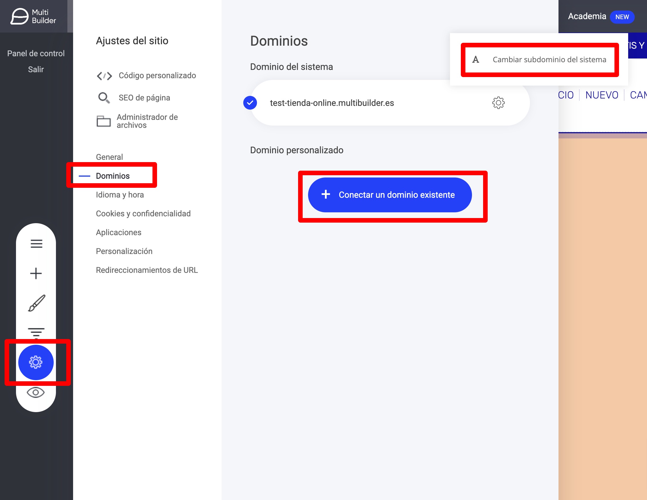 Como URL para tu web puedes elegir un subdominio sin coste alguno. Solo tienes que seleccionar Cambiar subdominio del sistema y elegir un nombre que no esté cogido por otro usuario de Multi Builder. Por ejemplo: tudominio.multibuilder.es. Es útil mientras estás creando tu web, aunque puedes utilizarlo el tiempo que quieras.