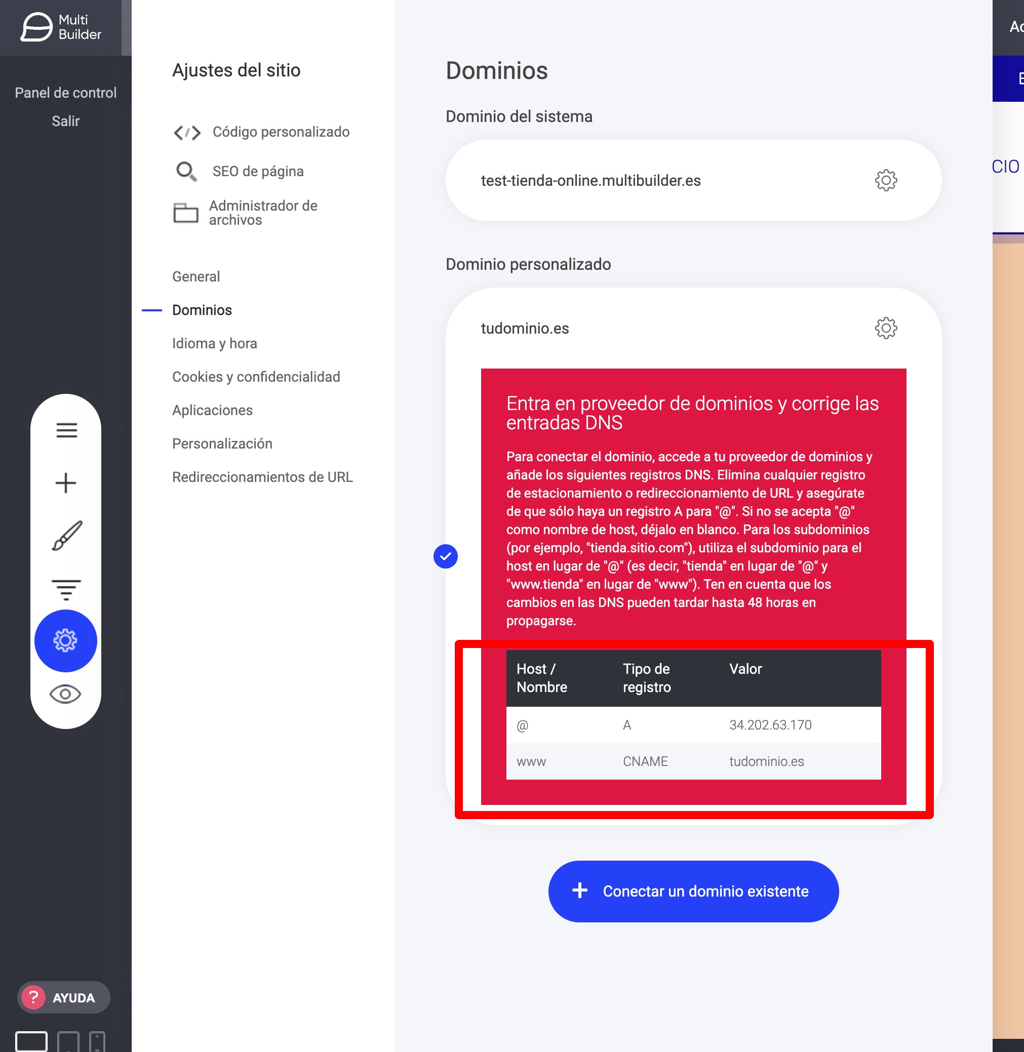 Pero lo mejor es tener tu propio dominio. Si ya lo tienes, ve a Conectar un dominio existente, introduce el dominio y te aparecerán los registros de DNS que tienes que cambiar con instrucciones detalladas. Si aún no tienes dominio, nosotros te ayudamos a conseguir uno.