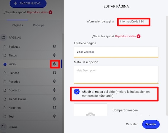 Dentro del Multi Builder, para indicar que queremos indexar una página iremos a Ver ajustes>Información de SEO y marcaremos la casilla Añadir al mapa del sitio (mejora la indexación en motores de búsqueda):