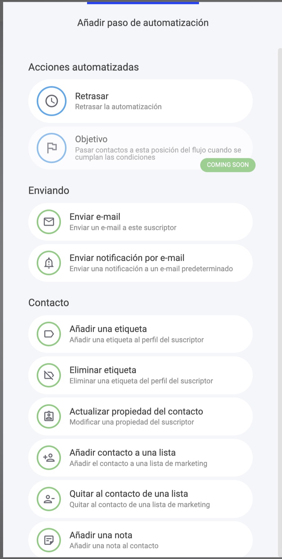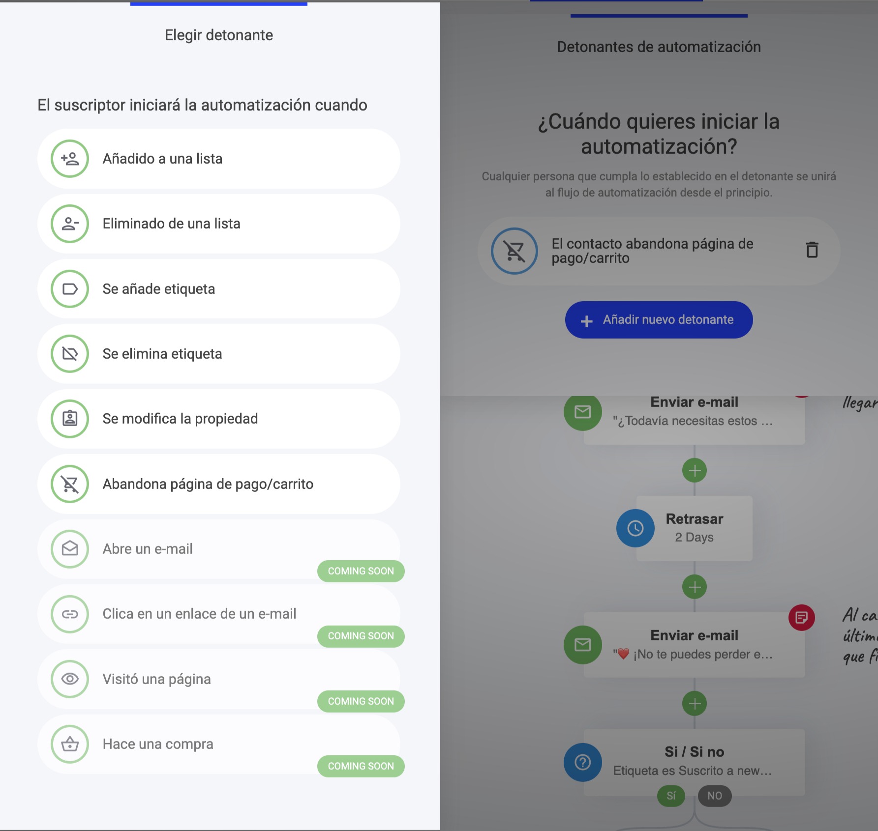 Las automatizaciones te permiten ahorrar tiempo y esfuerzo creando flujos que se ponen en marcha automáticamente cuando un contacto entra en una lista de distribución, se le asigna una etiqueta o realiza algún tipo de acción en tu sitio web.