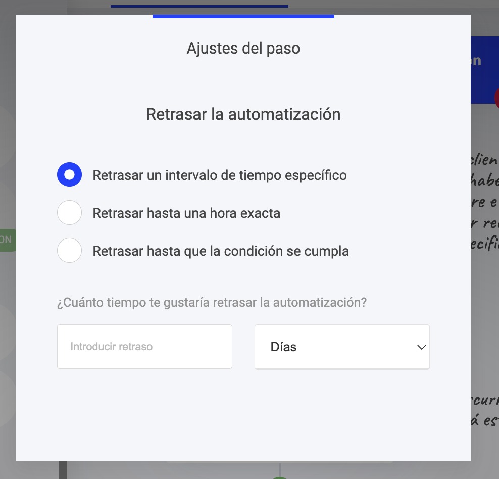 Dentro de las acciones, existe una en especial que utilizaremos muy a menudo. La acción de retrasar nos permite decidir cuándo se enviará un e-mail (por ejemplo, en una fecha concreta) o cuántas horas o días deben transcurrir entre una acción y la siguiente.