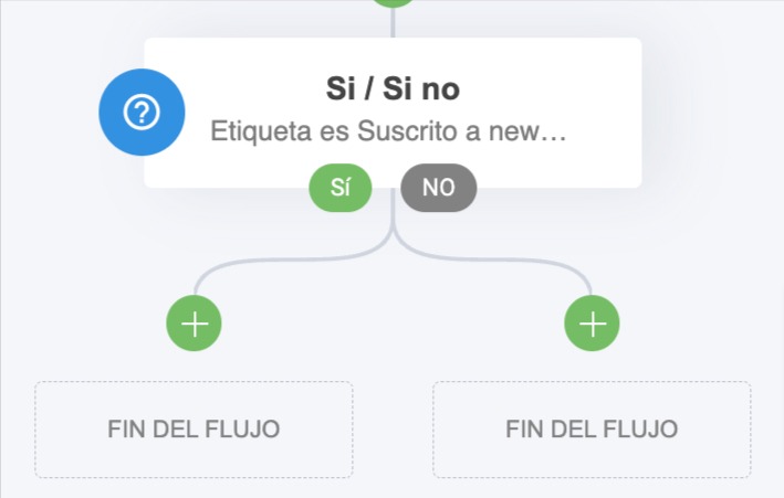 Para esta condición añadimos un filtro con lo que queremos que ocurra (o que no ocurra) y obtenemos una bifurcación del flujo. Si se cumple (SÍ) pasará una acción; si no se cumple (NO), la acción será otra.