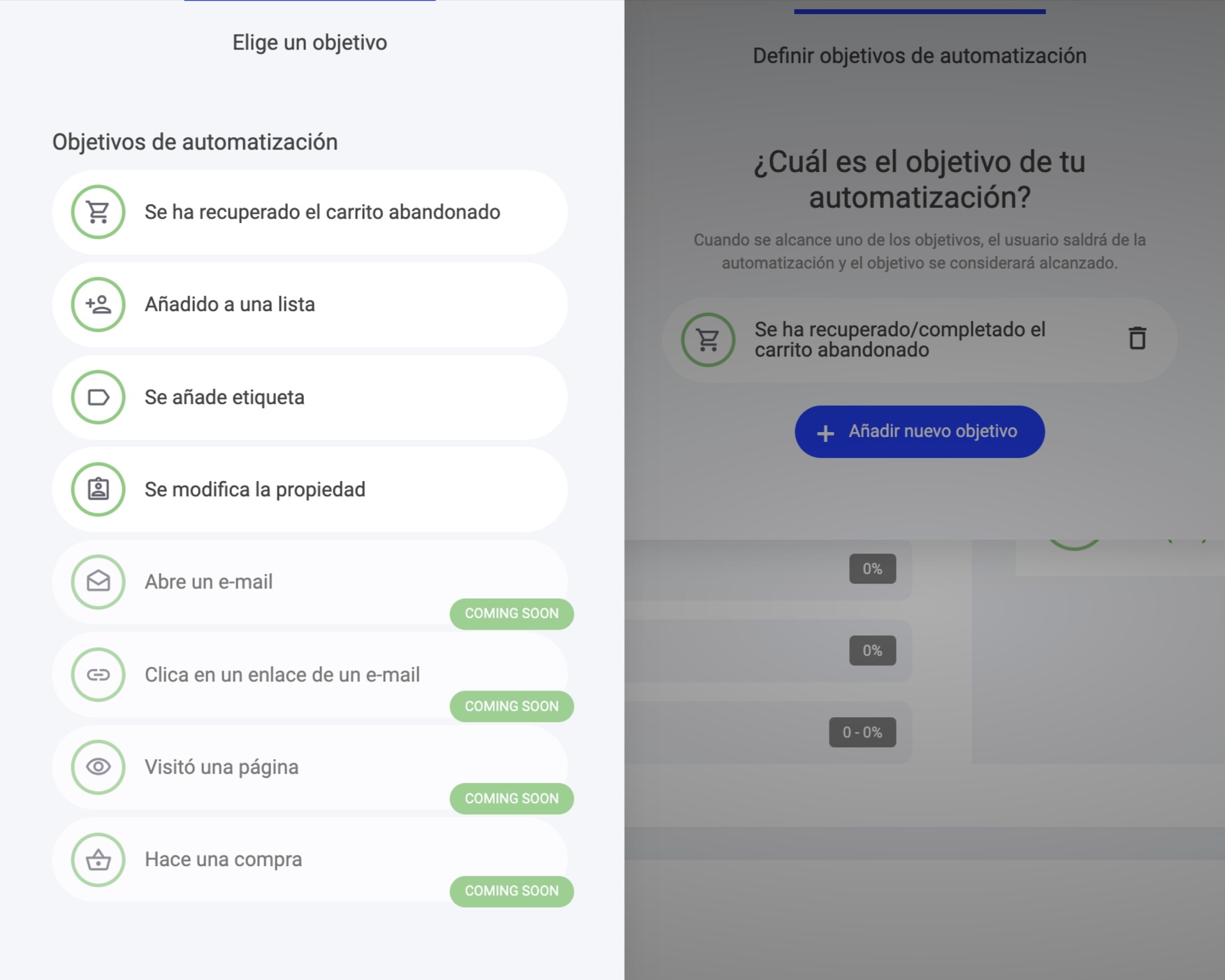 En los objetivos definimos el motivo por el cual hemos creado cada flujo de automatización. Todos los objetivos se reflejarán posteriormente en las estadísticas del flujo y nos permitirán valorar el éxito que están teniendo nuestros procesos de captación de clientes.