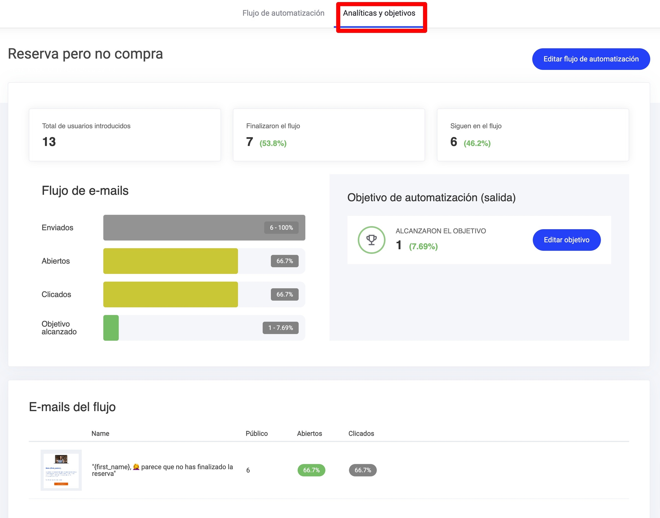 En la pestaña de Analíticas y objetivos veremos el resultado de nuestra automatización desde el momento en que empiecen a entrar usuarios en el flujo.