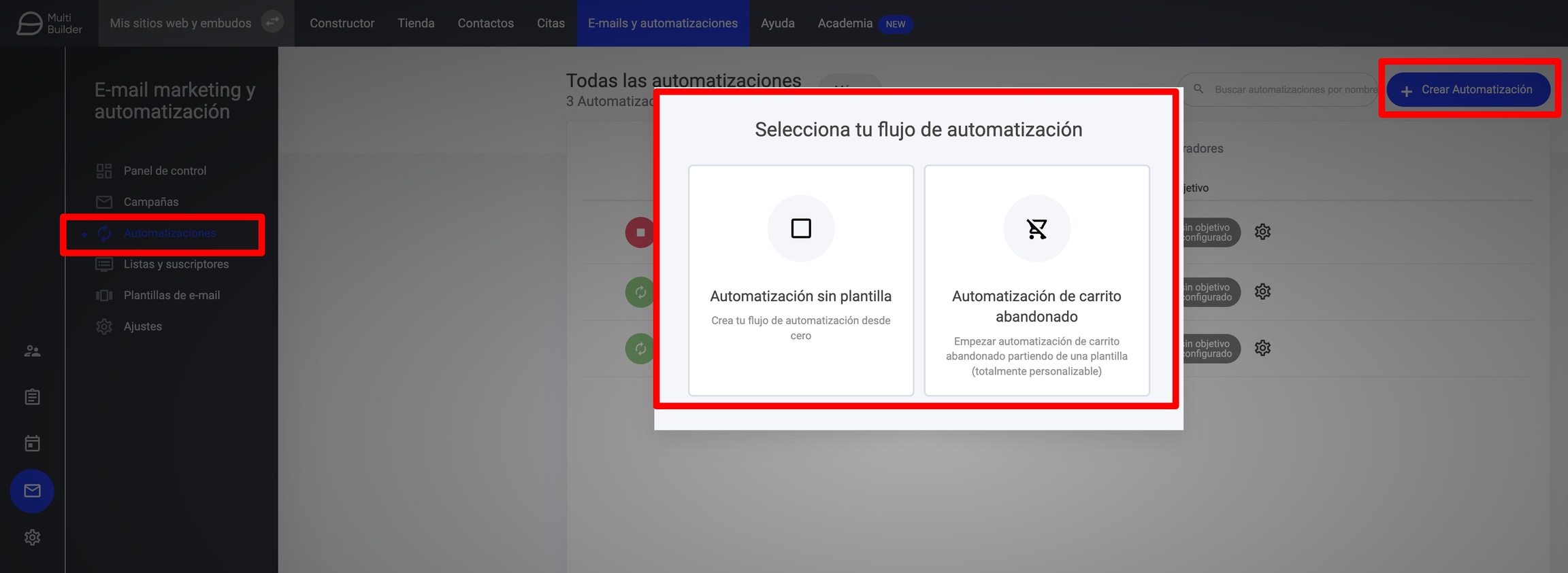 Para iniciar una automatización iremos a E-mails y automatizaciones>Automatizaciones>Crear Automatización. Desde aquí podremos crear una desde cero o empezar con un flujo preconfigurado para carritos abandonados.
