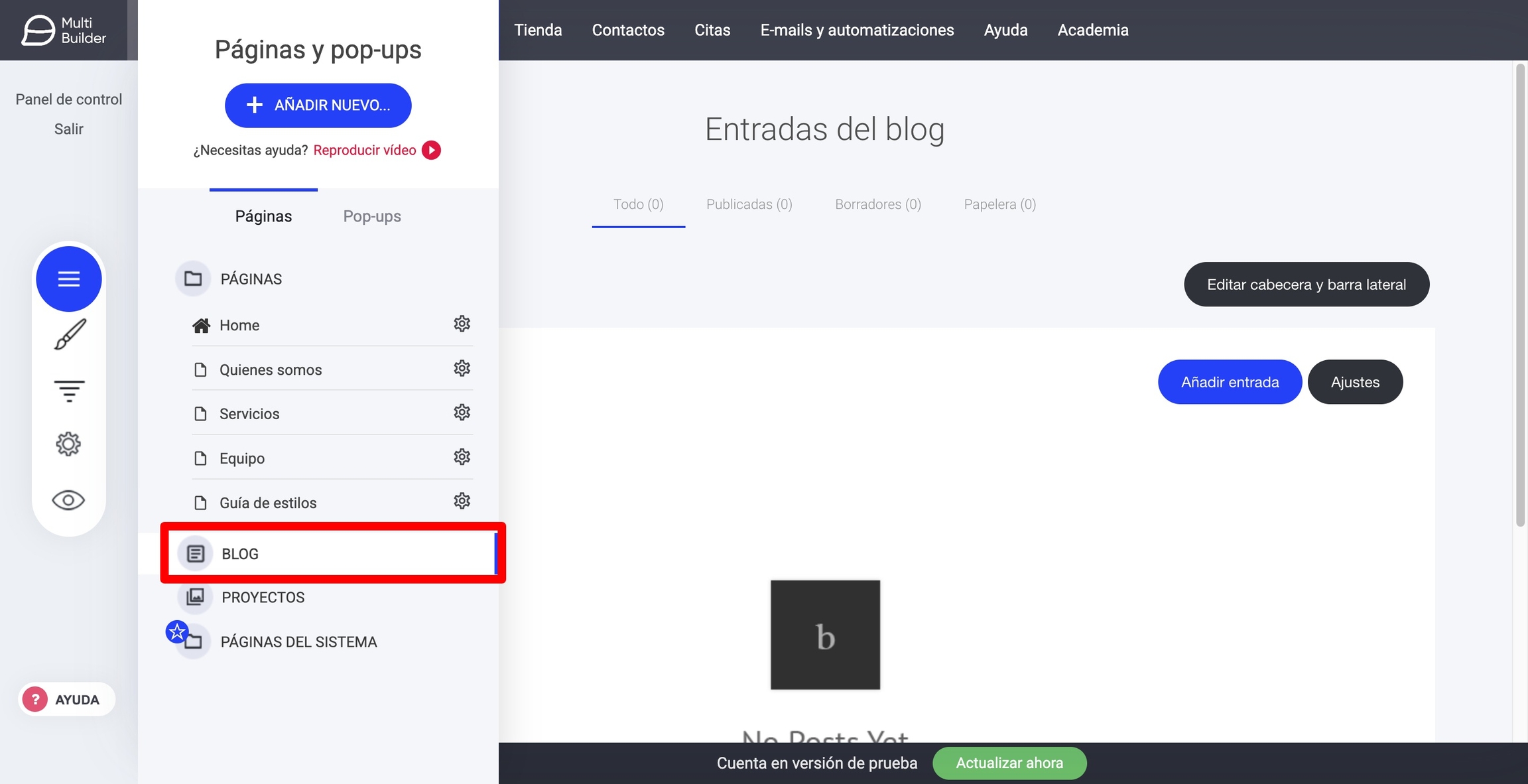 Una vez creado el blog, aparecerá un elemento debajo de la carpeta de Páginas que nos llevará directamente a la configuración del blog.