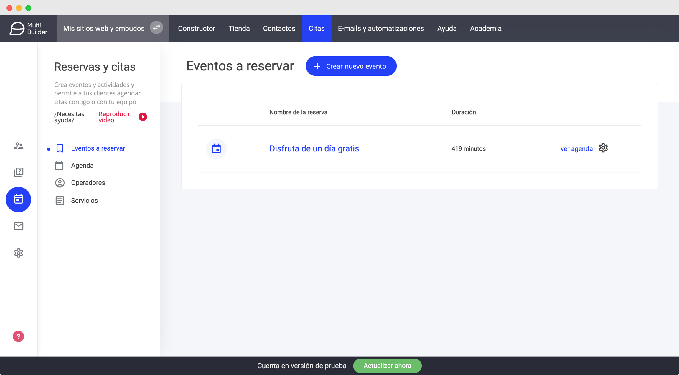 Antes de poder insertar el widget de Citas en la página web, es necesario ir a la pestaña Citas y configurar el Evento para el que se hará la reserva.