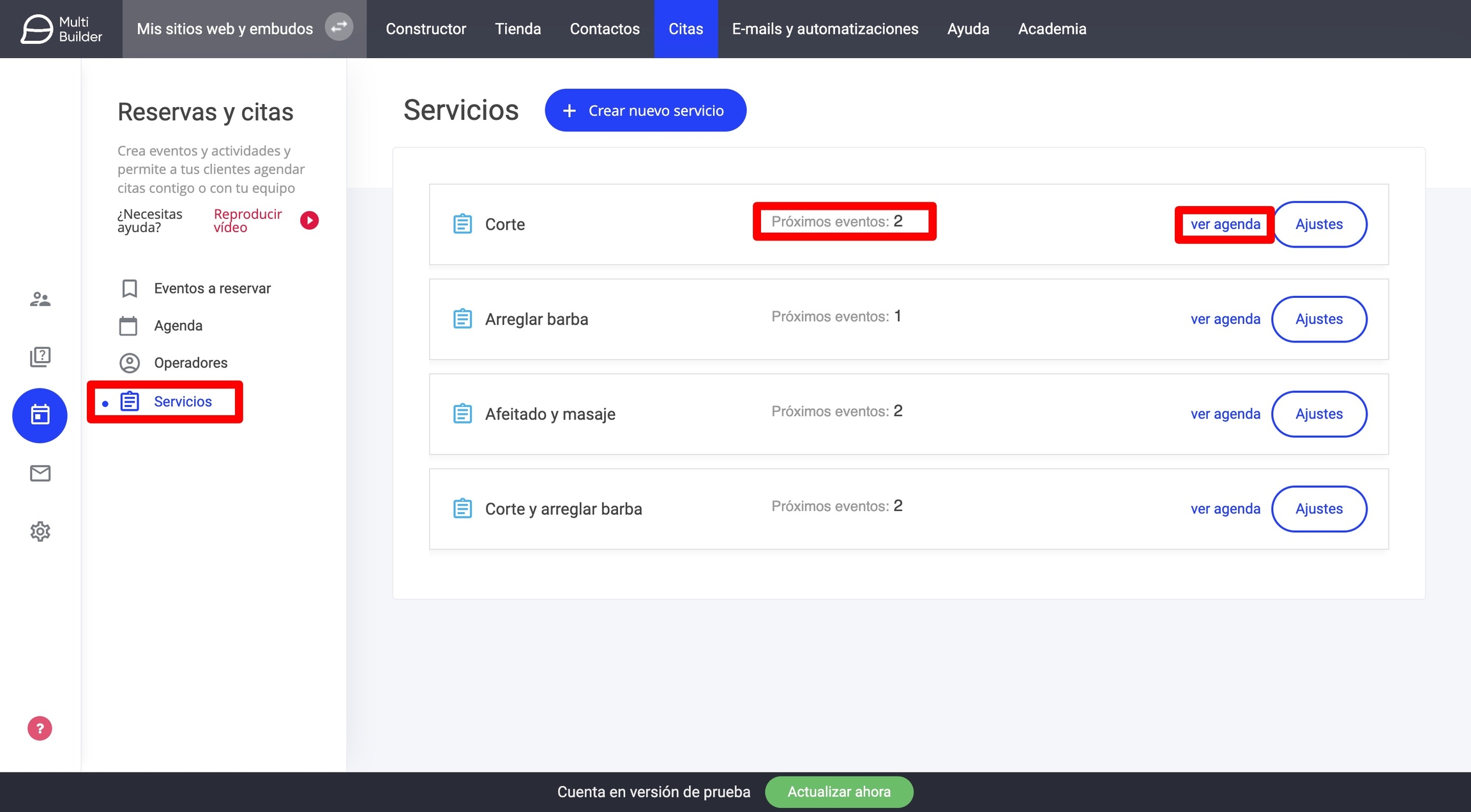 Desde la sección de Servicios puedes ver la agenda específica para cada servicio y las próximas citas programadas.