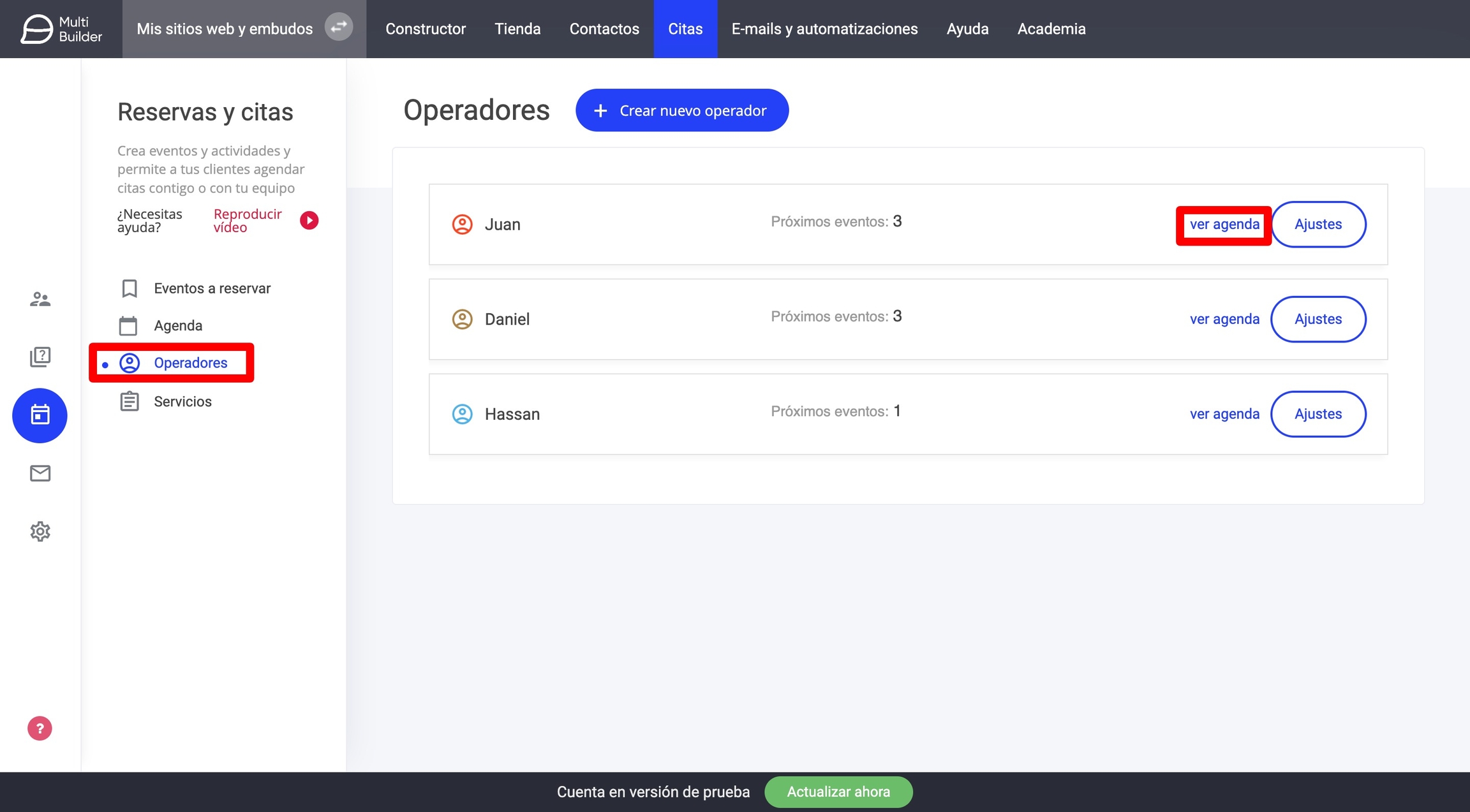 Es la persona o el negocio que realiza la presentación del evento o presta el servicio. Desde esta sección tendrás una vista general de todos tus Operadores y accederás a la Agenda de cada uno de ellos.