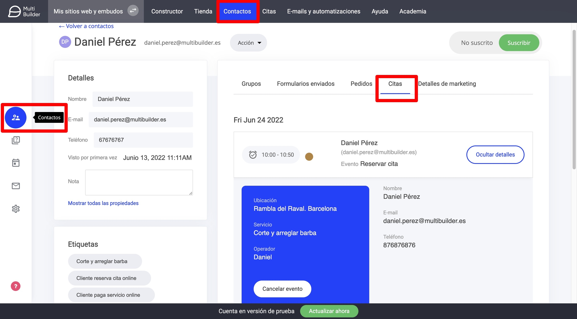 Por último, todas las citas programadas aparecerán en la ficha del contacto de tu CRM, junto al resto de sus datos, formularios enviados, pedidos de la tienda online (si existe) y estadísticas de tus actividades de marketing.