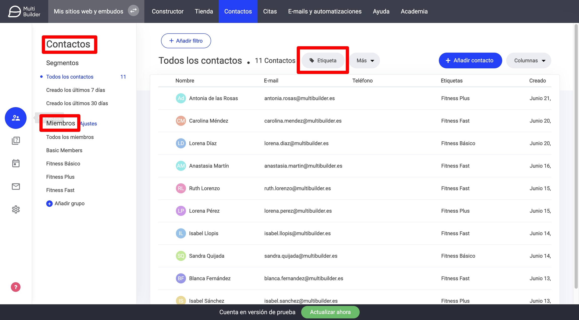 Etiquetas: es una forma de localizar y agrupar contactos según las acciones que lleven a cabo en nuestra web: rellenan un formulario, compran un producto, agendan una cita, se suscriben a un curso online, completan un cuestionario o encuesta, etc. Las etiquetas las podemos ir creando según las necesitemos directamente desde los widgets de formularios, módulos de pago, encuestas, citas, registros de miembros...
