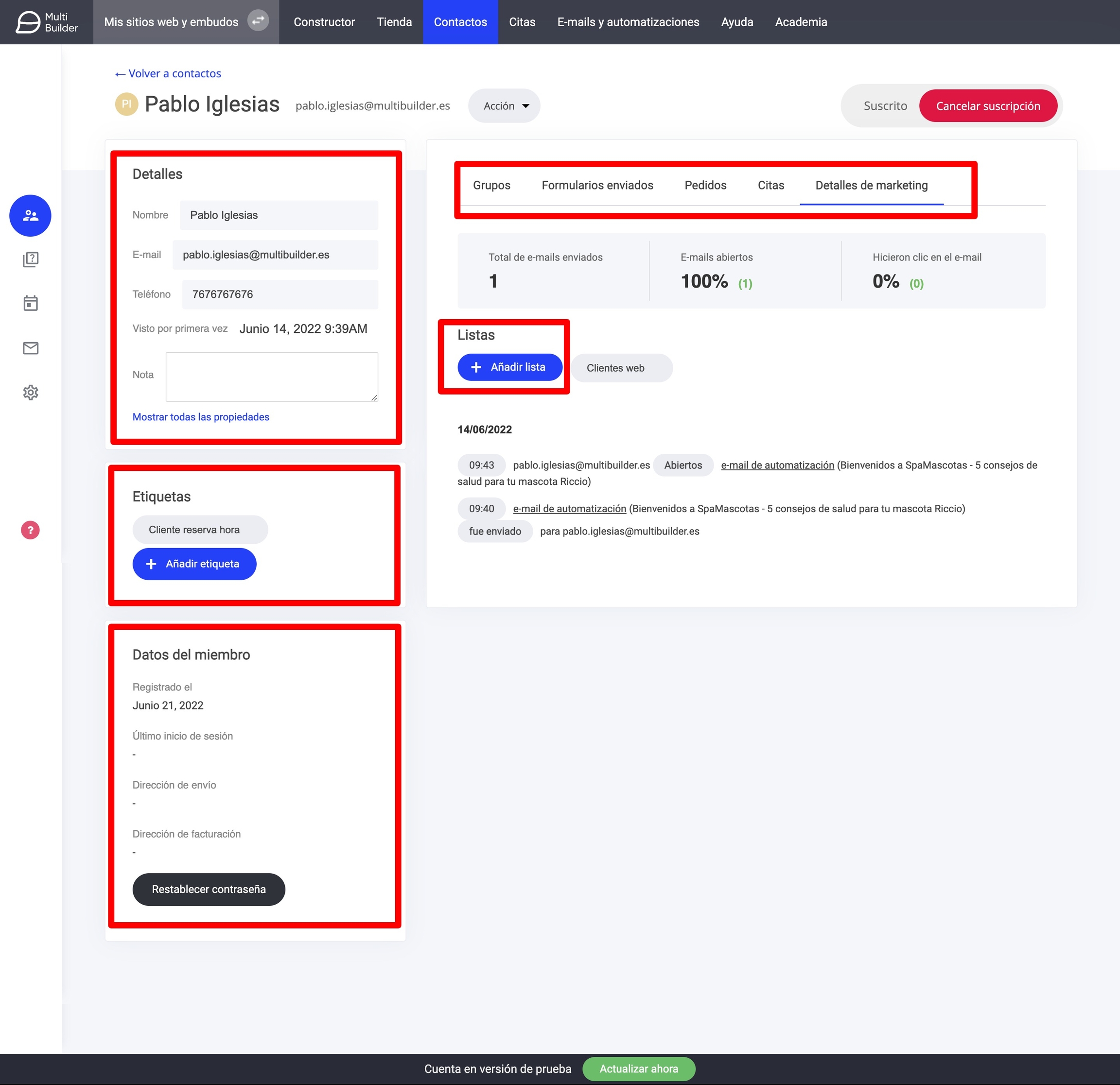 Datos del miembro: si el contacto forma parte de un grupo de miembros, ya sea porque ha comprado un producto o tiene acceso a contenido restringido.