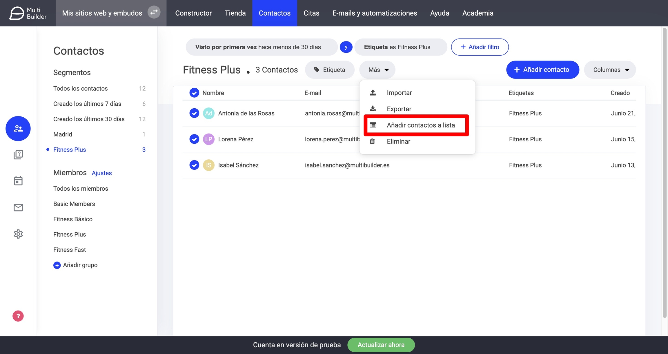 Consejo: Una vez creado un segmento, podemos seleccionar a todos los contactos y pasarlos a una lista de distribución.