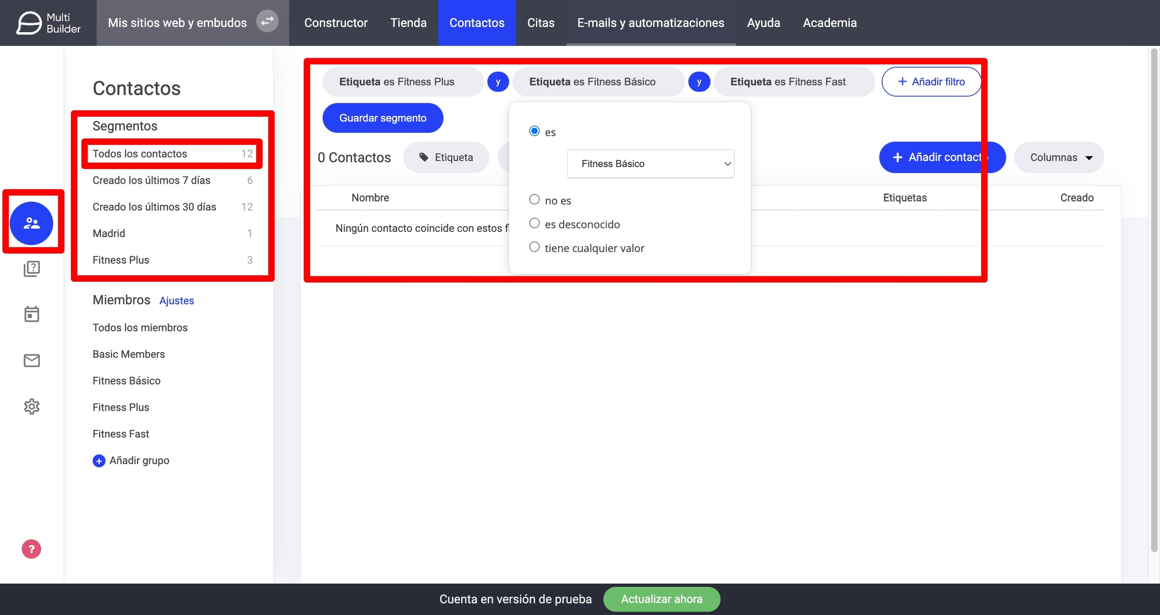 Podemos añadir más de una variable al filtro que irán unidas por "y". Finalmente guardamos el segmentos y este aparecerá en la lista de Segmentos que vemos en Contactos.