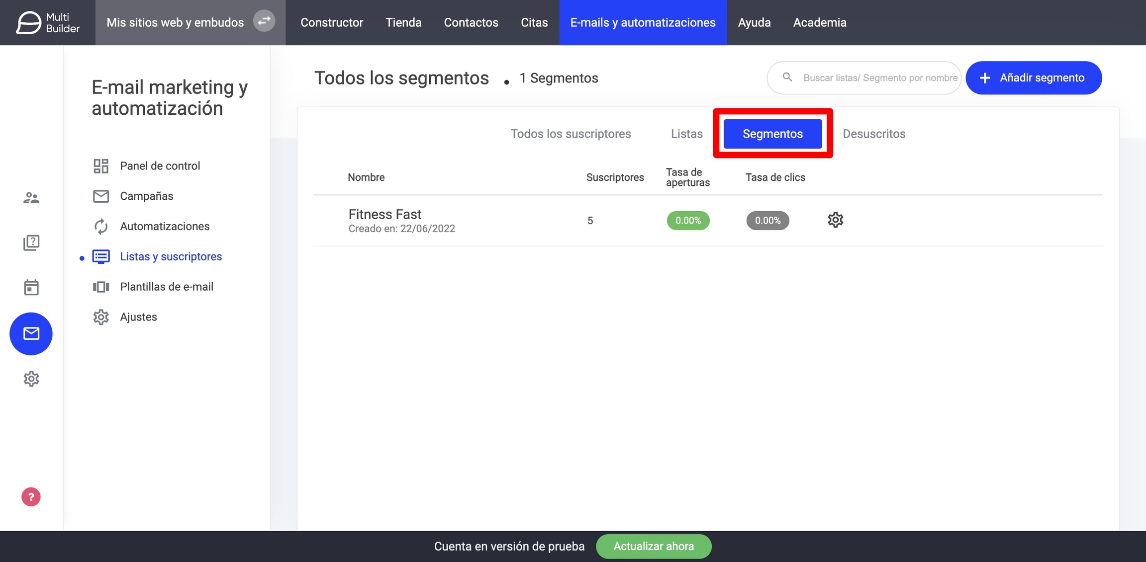 Segmentos que creamos en las listas de distribución de e-mail marketing. E-mails y automatizaciones>Listas y suscriptores.