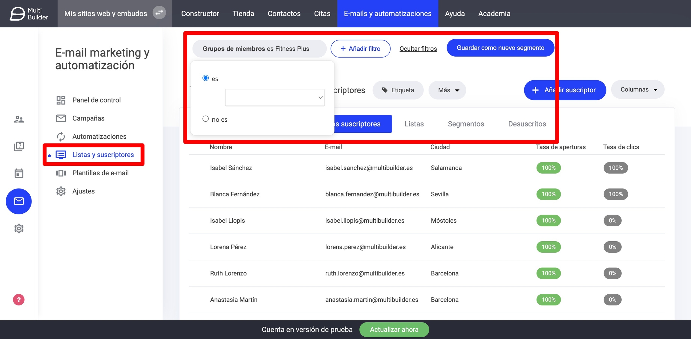 Desde E-mails y automatizaciones>Listas y suscriptores>Todos los suscriptores podemos crear sub-listas de aquellos contactos que reciban nuestras campañas de e-mails. De esta forma podemos mandar e-mails que les interesen solo a una parte de nuestros suscriptores.