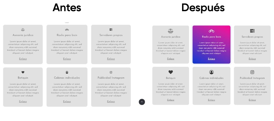 Para este artículo vamos a utilizar el widget Sección de icono y lo vamos a modificar para que, al pasar el ratón por encima, cambie el color de fondo y el color del texto. Le añadiremos también una ligera sombra y haremos que todo el bloque se pueda clicar para dirigir al usuario a otra página.