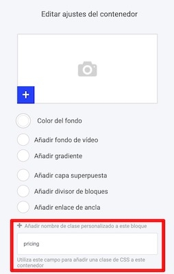 Cuando ya tengamos el bloque, en Ajustes del contenedor añadiremos la clase pricing en Añadir nombre de clase personalizado a este bloque.