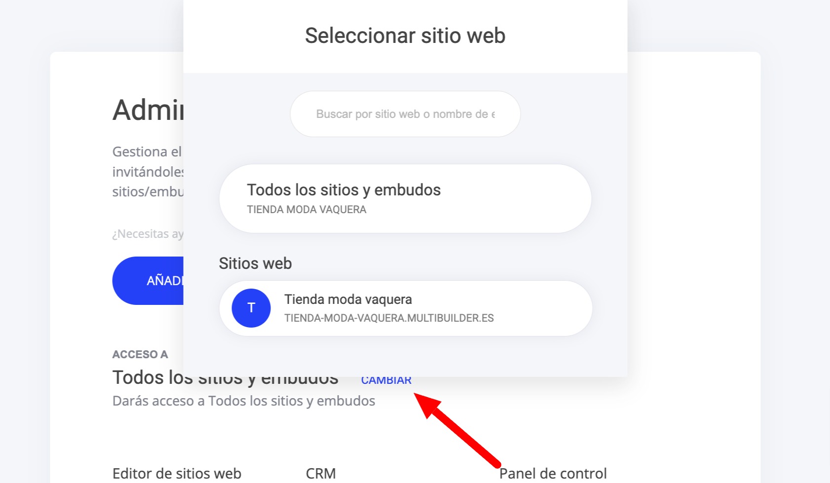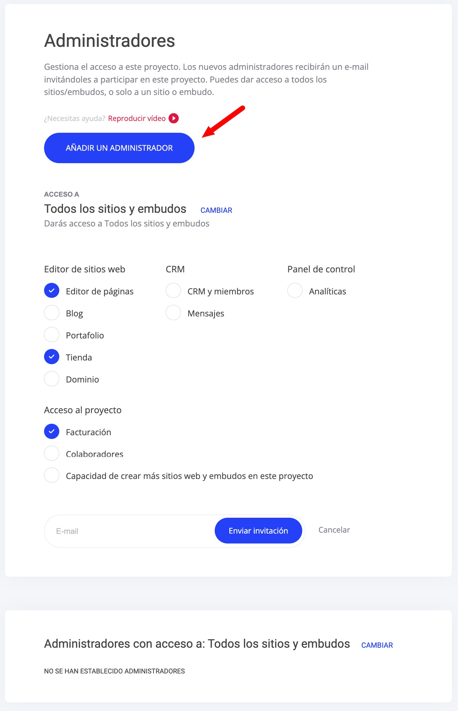 Desde Administradores puedes invitar a otras personas para que gestionen aspectos de tu web, como los contenidos, la facturación, el blog o la administración de la tienda online. Elige los derechos que les concedes, introduce su e-mail y les llegará una invitación para darles acceso a todas las webs y embudos de tu proyecto.