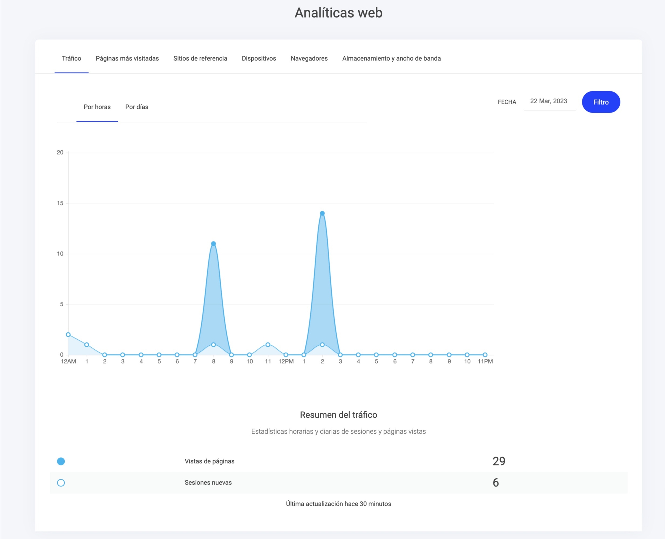 El tráfico diario/por hora de todas las páginas. Desde la pestaña Por días o Por horas, o fijando un rango de fechas, tendrás una buena visión del rendimiento de tu web y el número de visitas a las páginas.