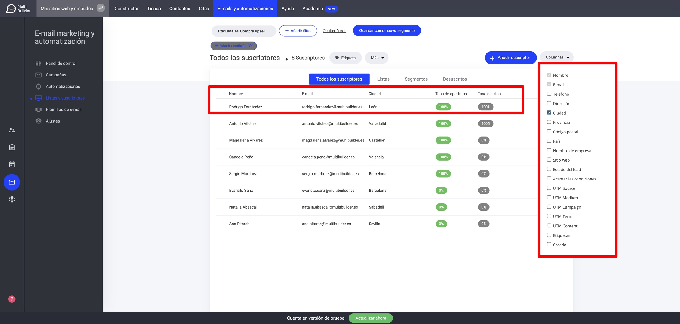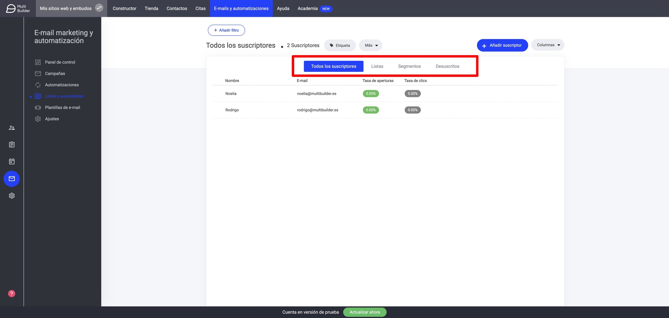 Desde Automatizaciones e E-mails>Listas y suscriptores vamos a una pantalla con 4 pestañas:
