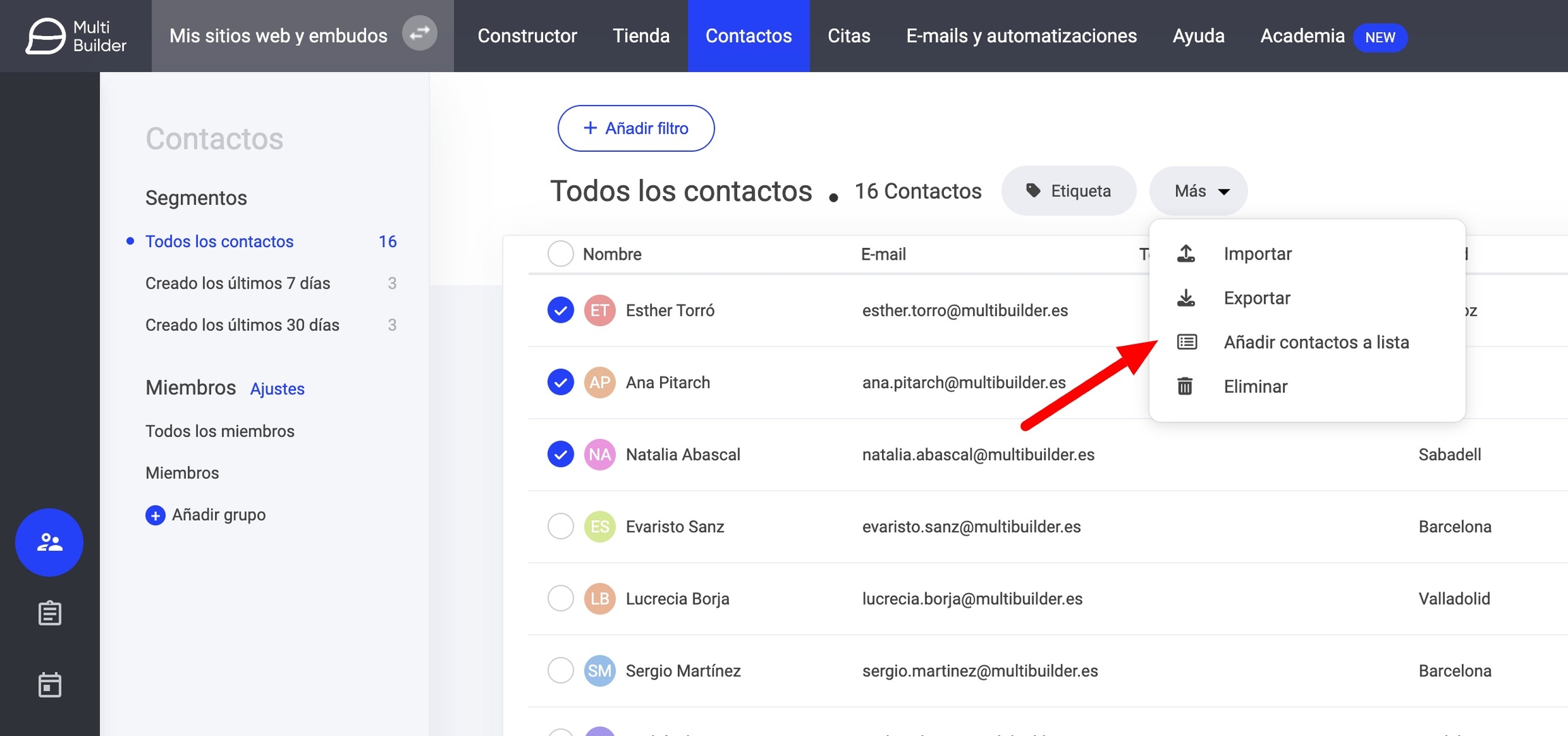 2. Otra forma es desde la lista de Contactos, donde podemos seleccionar uno o varios contactos e incluirlos en alguna lista de distribución, como puedes ver en la imagen.