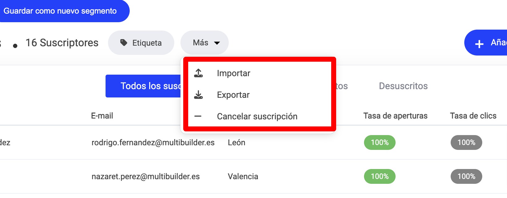 Por último, de la misma forma que incorporamos suscriptores de forma masiva, podemos seleccionar varios o todos los contactos y exportarlos a un archivo Excel en .csv, cancelar las suscripciones y asignarles etiquetas. Estas opciones las encontramos en los botones Etiqueta y Más (ver imagen ↓)