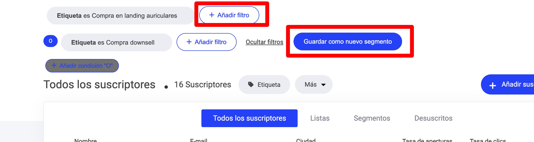 Para crear un segmento, desde Todos los suscriptores iremos a Añadir filtro y seleccionaremos un parámetro (por ejemplo: Etiqueta). A continuación le daremos un valor (por ejemplo, que contenga o no contenga una determinada etiqueta).