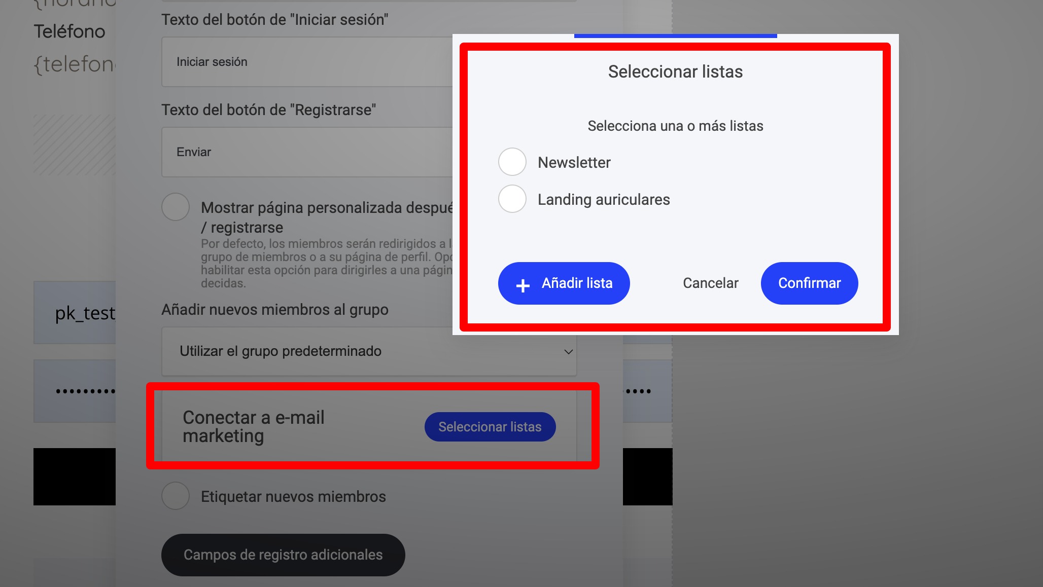 1. Desde el menú de ajustes de los widgets de Formulario, Cuestionario, Citas, Registro de Miembros y Módulo de pago, encontramos la opción Conectar a e-mail marketing. Deberemos seleccionar una de las listas.