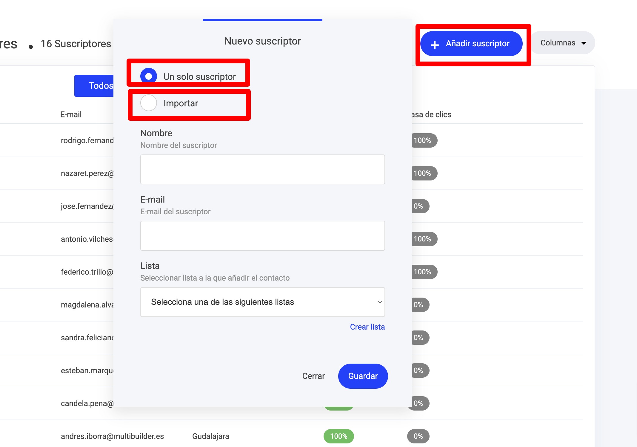 3. También podemos añadir manualmente suscriptores uno por uno, indicando su nombre y su e-mail.