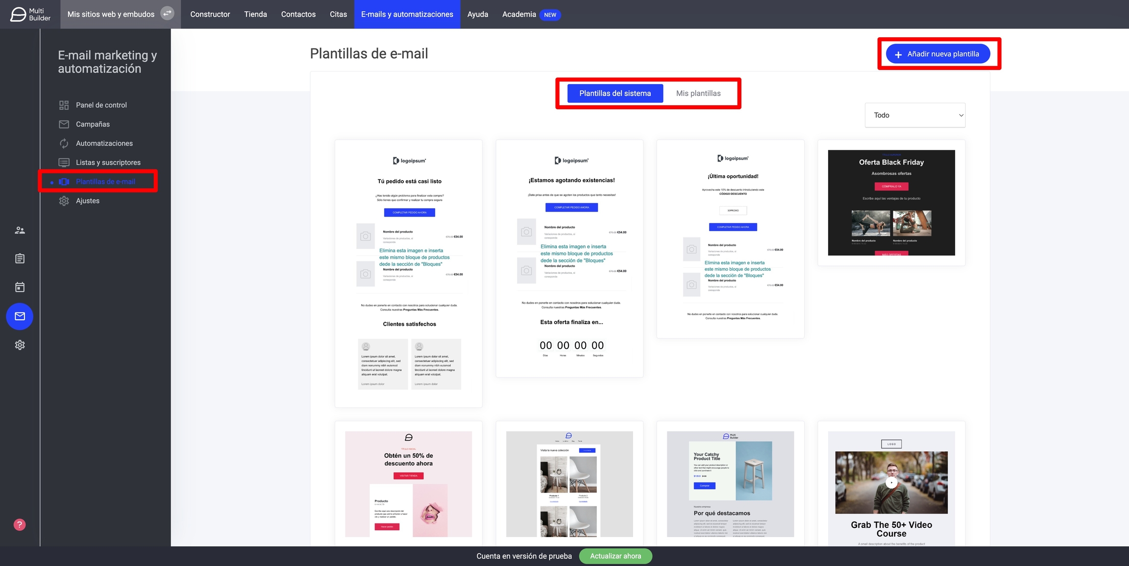 Desde E-mails y automatizaciones>Plantillas de e-mail creamos las plantillas que enviaremos en campañas masivas de e-mail y también en las secuencias de las automatizaciones. Los e-mails los podemos crear partiendo de una plantilla del sistema que clonaremos, o empezar desde cero.