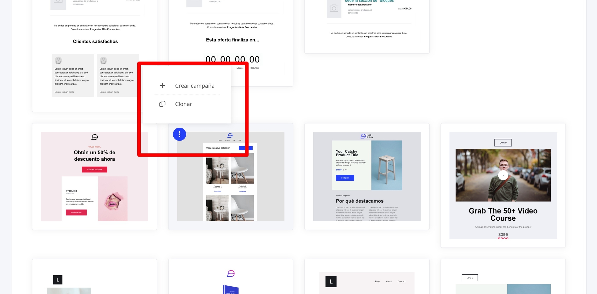 Desde el menú que aparece en la plantilla del sistema que queramos usar podremos elegir entre clonarla para crear una nueva plantilla en Mis plantillas o iniciar directamente una campaña. Ver Campañas de e-mail.