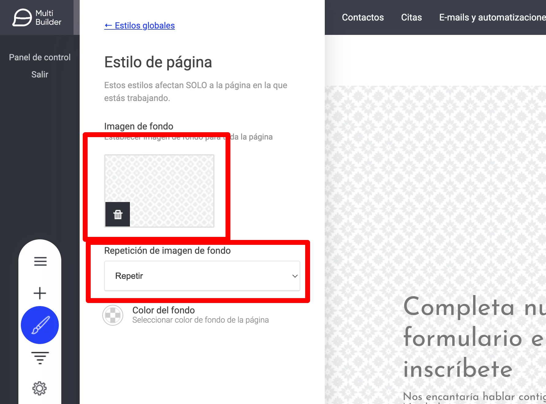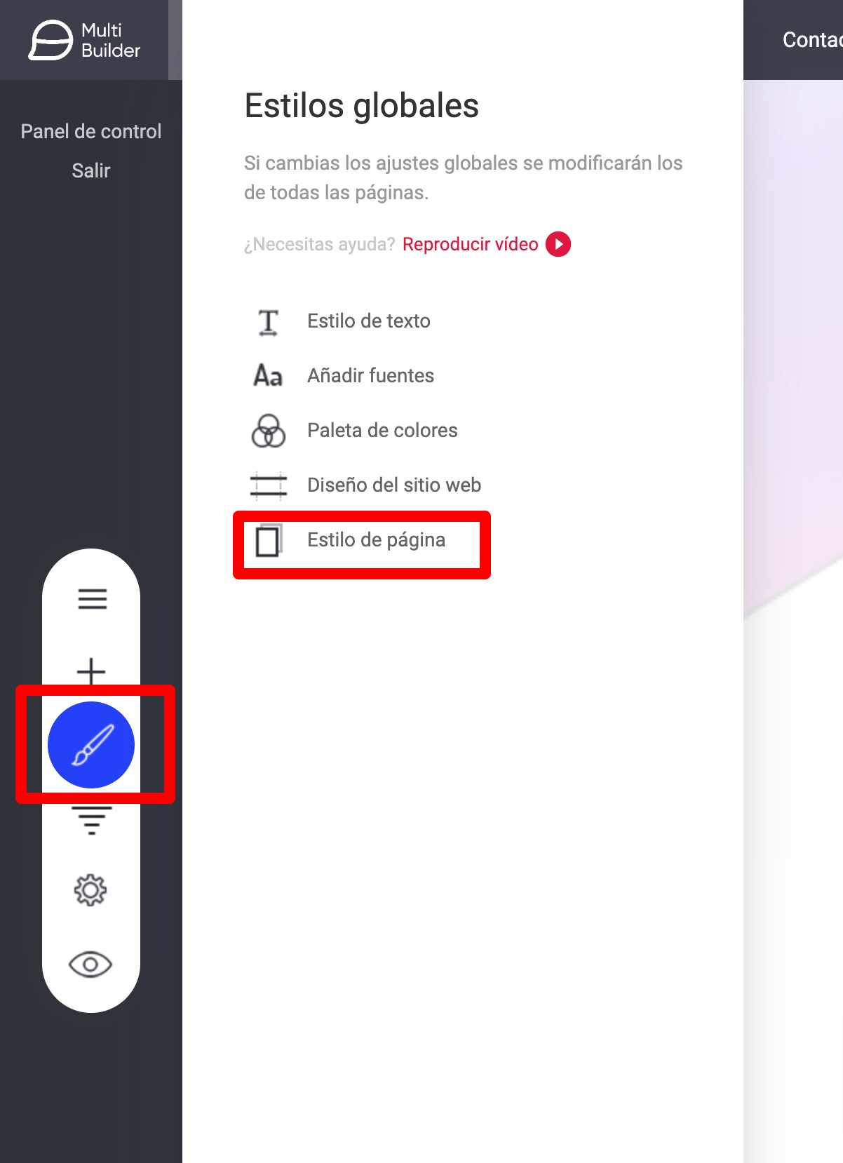 Desde Estilos globales>Estilo de página ajustamos el fondo de una página (este ajuste NO es global, sino que solo afecta a la página sobre la que estamos trabajando).