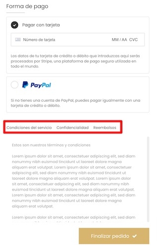 Estos tres textos te aparecerán en el módulo de pago cuando el cliente se disponga a finalizar la compra. Los verás en forma de tres pestañas. Aquí tienes un ejemplo: