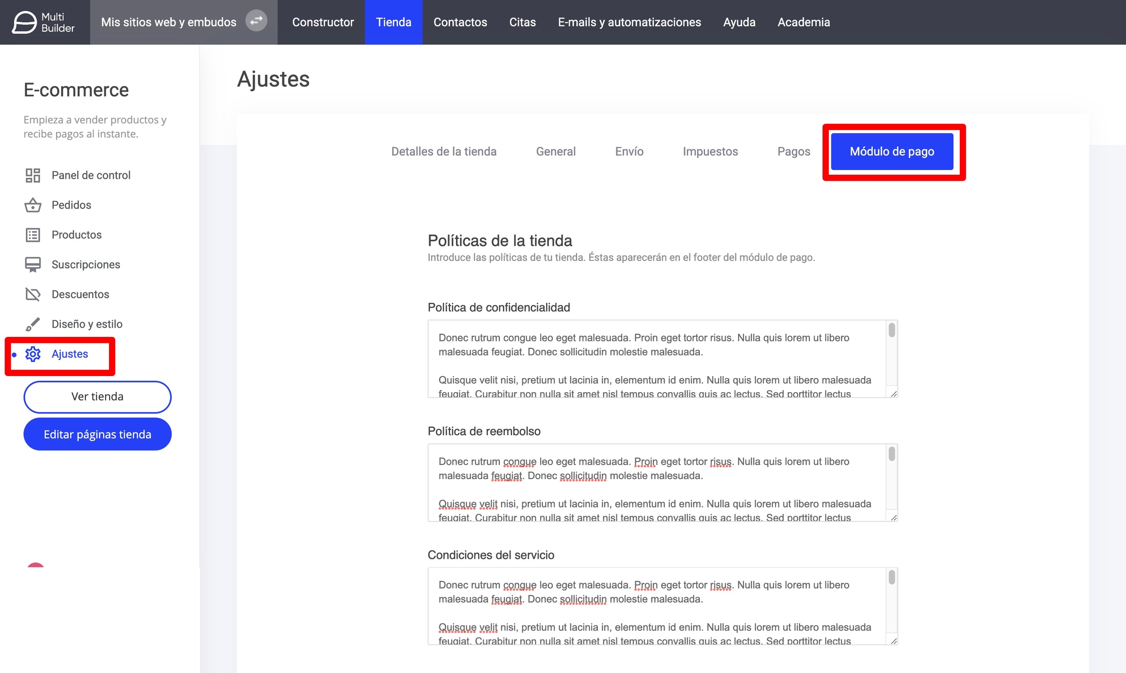 Por último introducimos los textos legales relativos a tu tienda online. Vamos a Tienda>Ajustes>Módulo de pago.