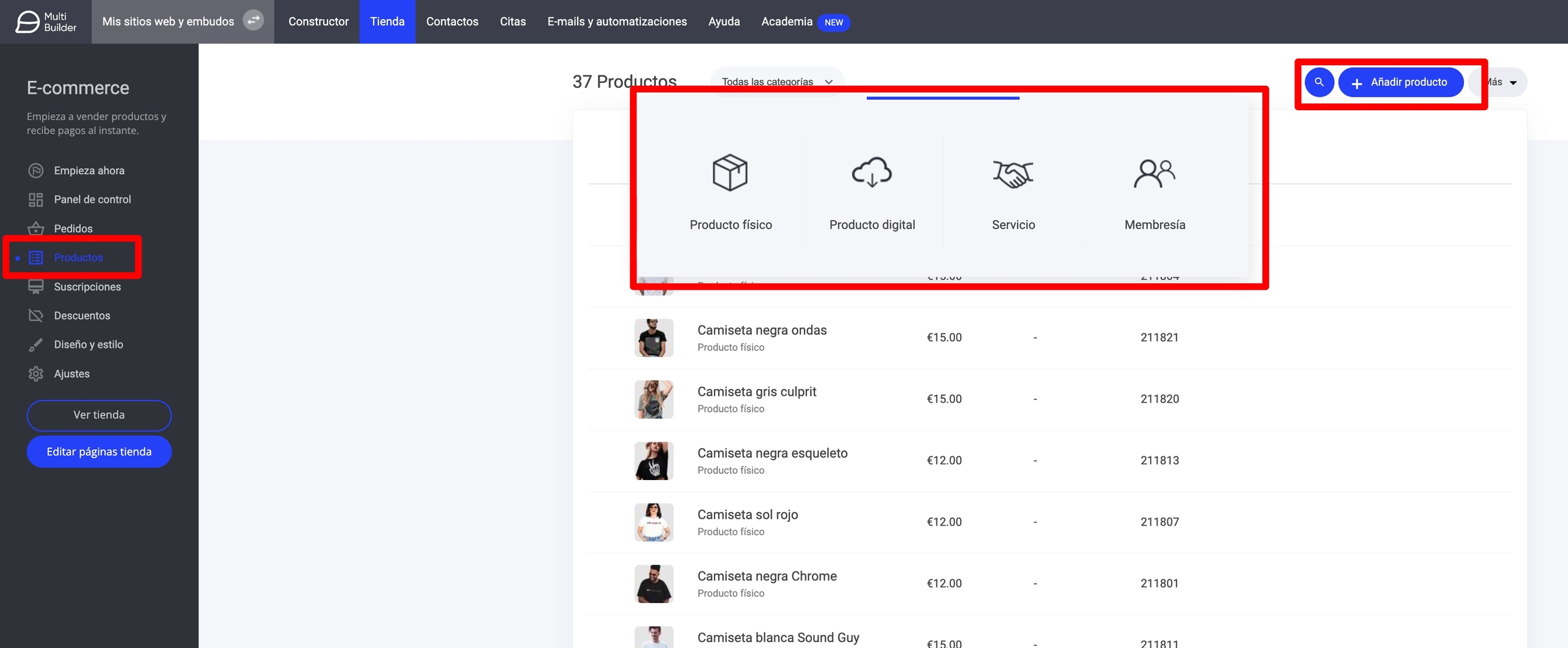 Para añadir y configurar los productos de nuestra tienda online iremos a Tienda>Productos y haremos clic en Añadir producto.