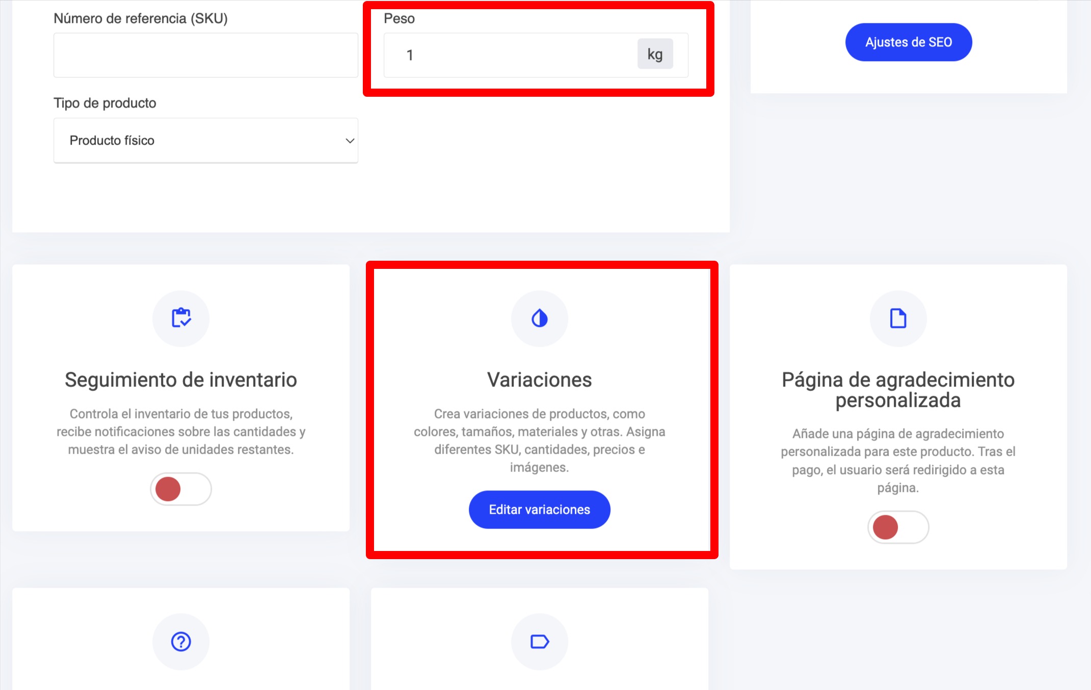 Seguimiento de inventario: aquí indicamos el stock que tenemos de cada producto. Lo más normal es utilizarlo en productos físicos, por ejemplo cuando vendemos prendas de ropa y queremos llevar un control de las existencias.