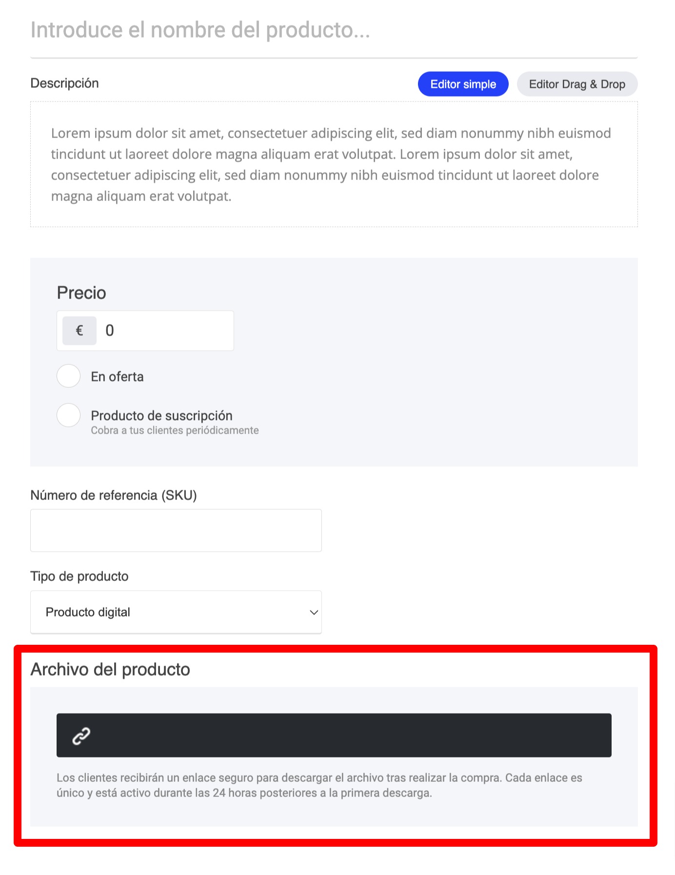 Aquí solo encontraremos una opción diferente: Archivo del producto, donde enlazaremos un archivo que ya hayamos subido al Administrador de archivos. Se pueden subir ficheros de hasta 130 GB. En enlace que reciben los clientes al comprar este tipo de productos permanecen activo 24 horas tras la primera descarga.