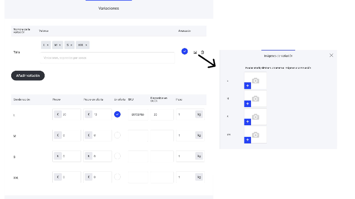 Desde el icono de imagen podremos adjuntar una imagen diferente para cada variación.