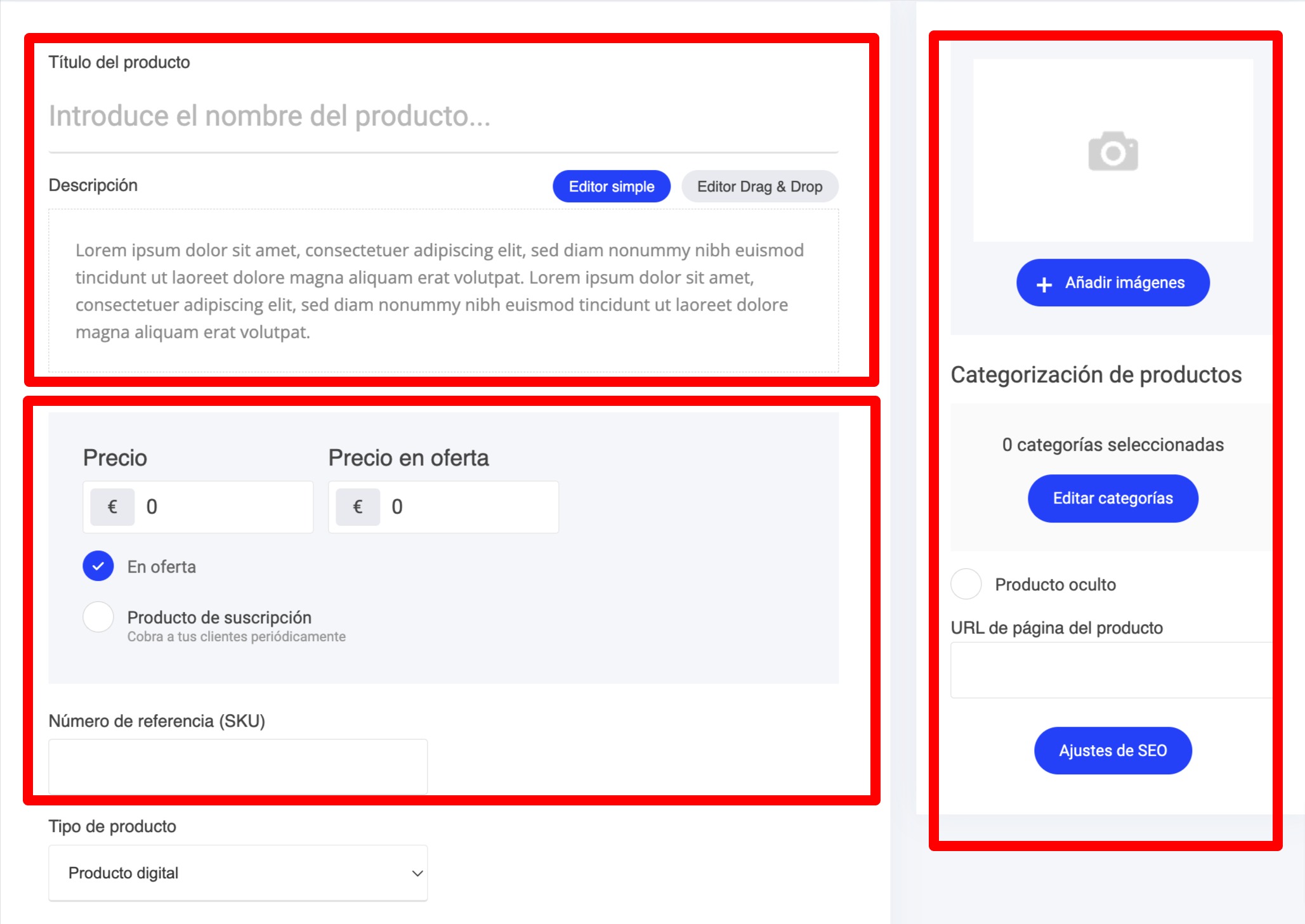 Descripción del producto: aquí podemos escribir un texto simple o utilizar el editor drag & drop para crear descripciones creativas con bloques e imágenes.