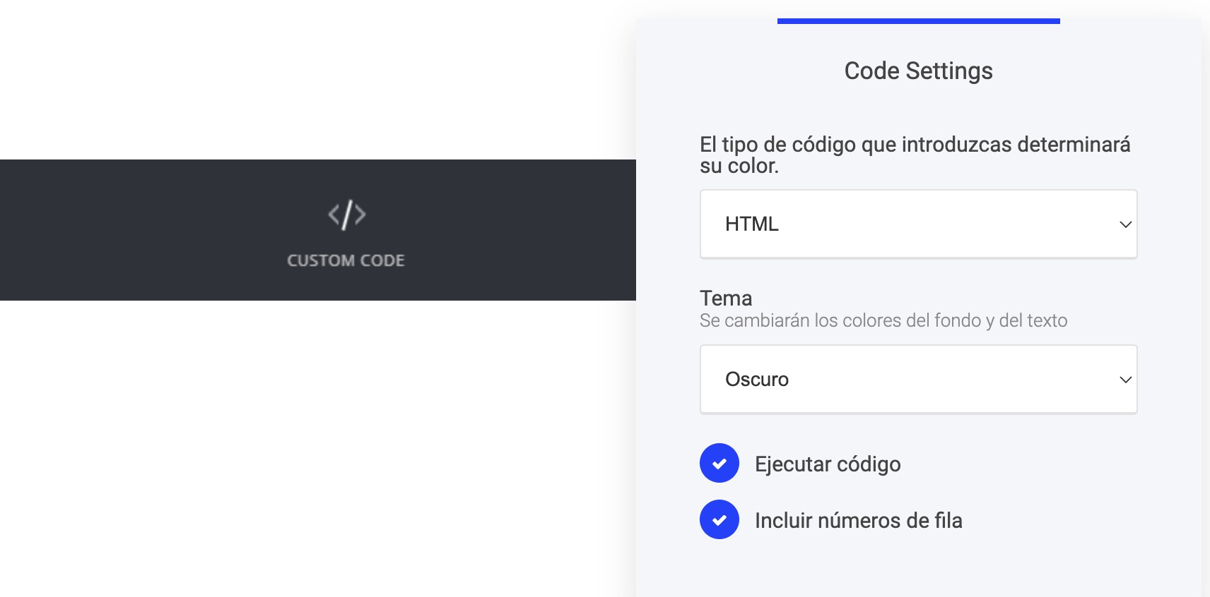 Si queremos que el código se ejecute en la página, seleccionaremos HTML y marcaremos Ejecutar código.