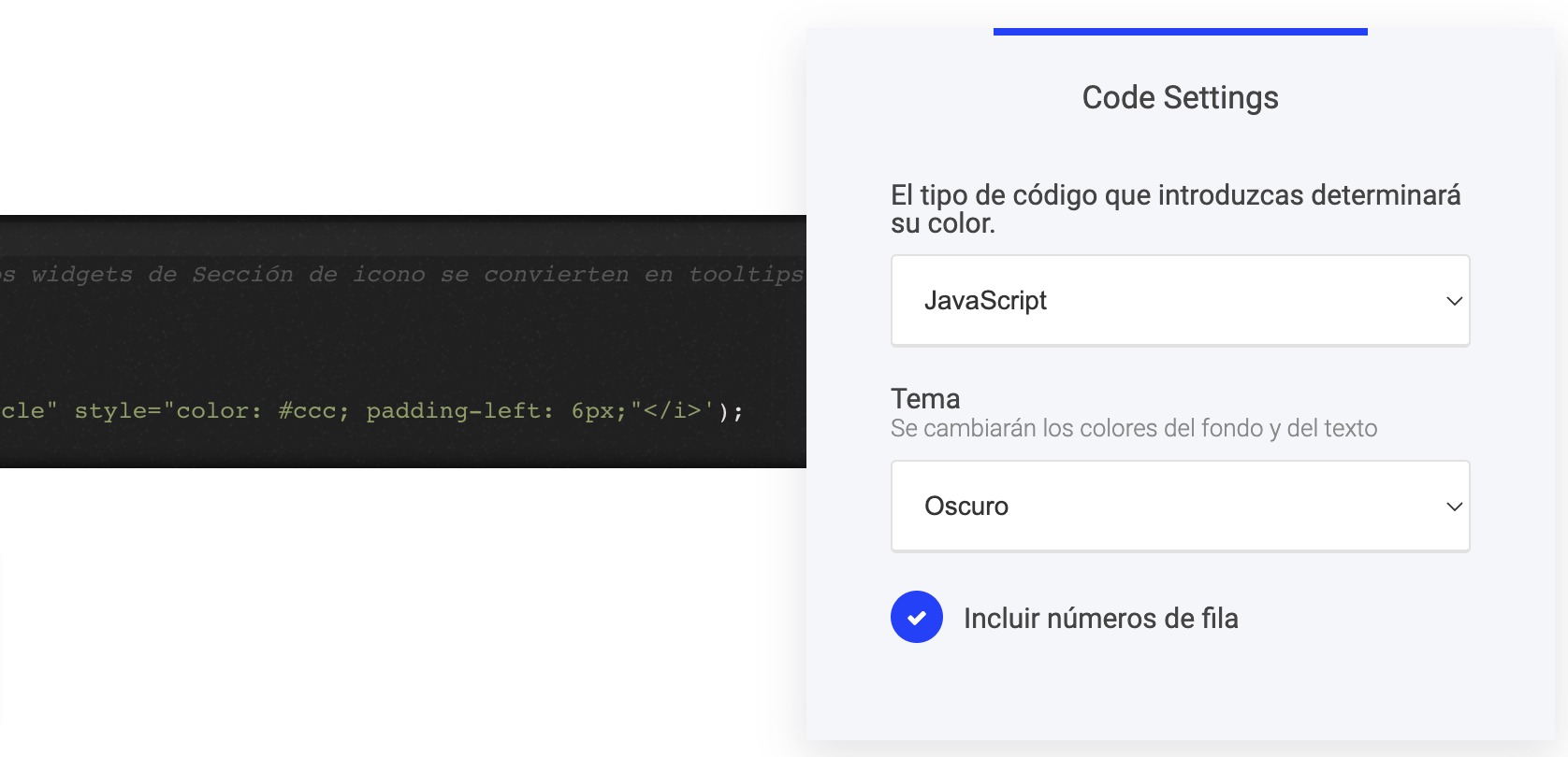 Las otras dos opciones son el tema, que es la combinación de colores del código y el fondo, claro u oscuro. E Incluir los número de fila o no, que es lo habitual en los editores de código.