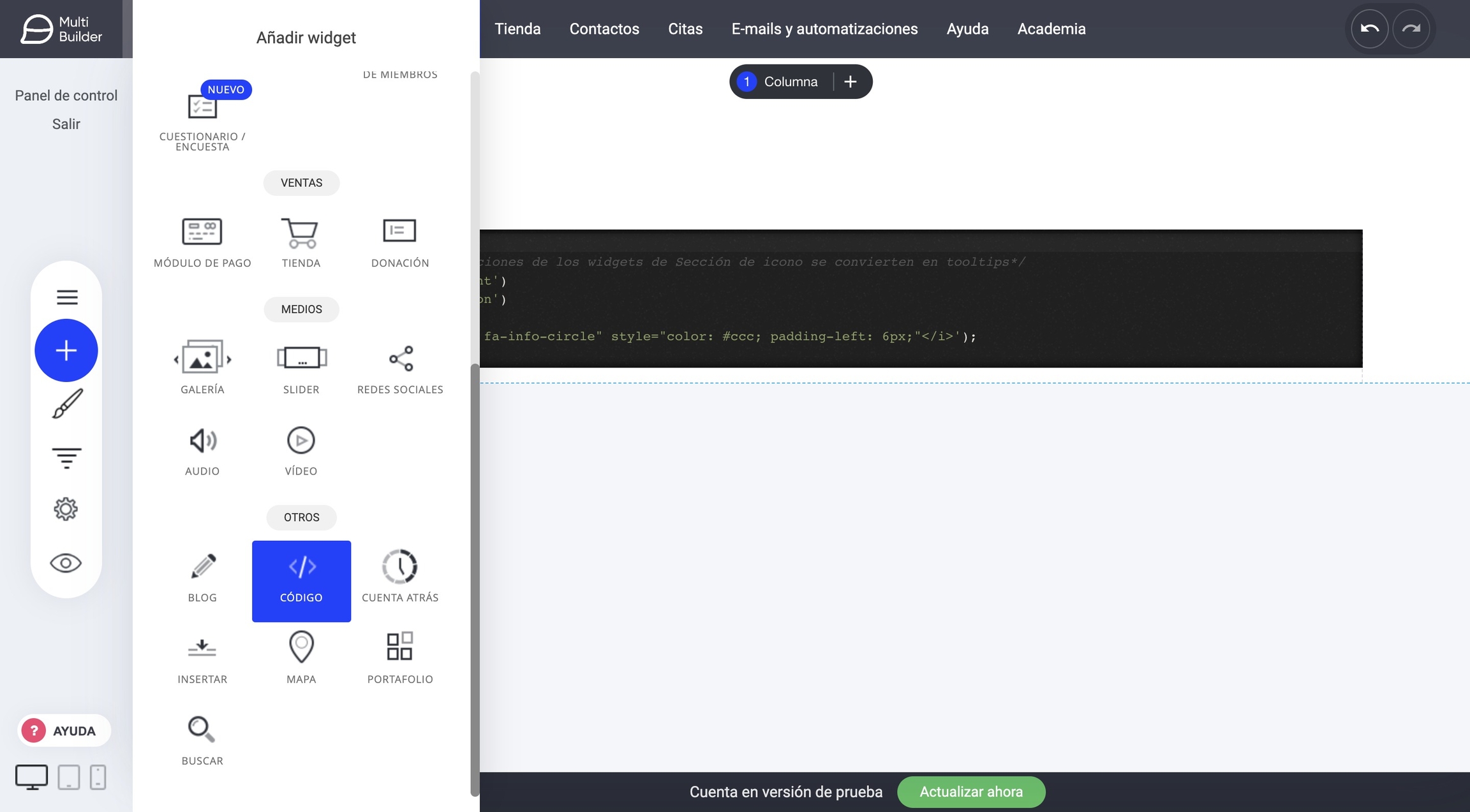 En Añadir widget>Otros, encontramos el widget de Código que sirve para dos cosas: