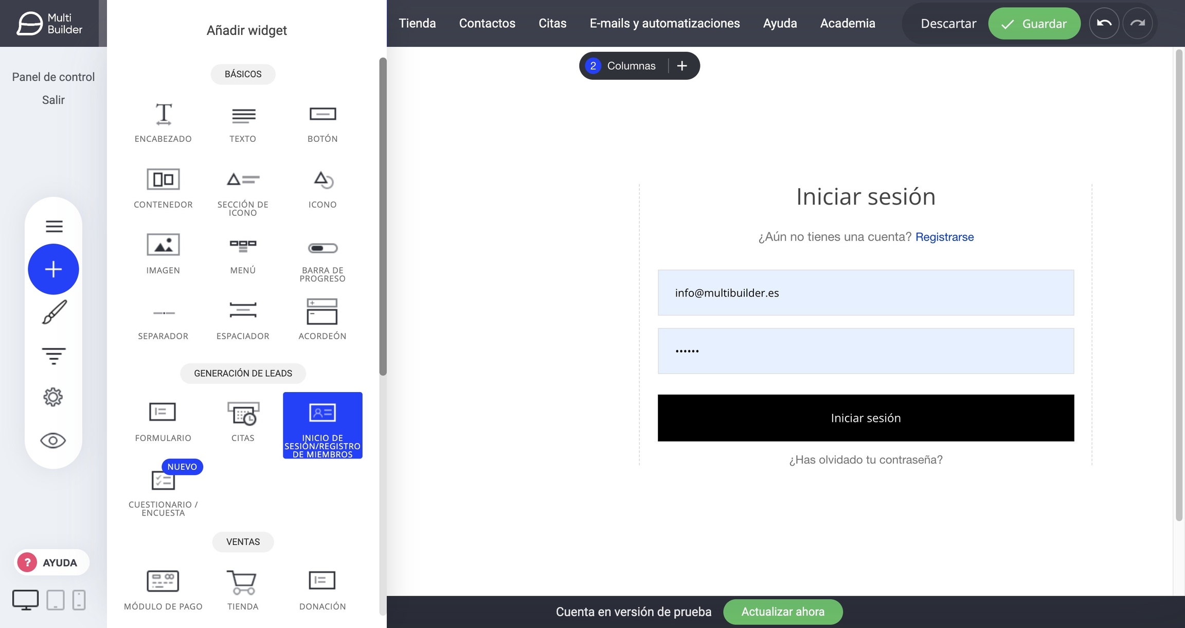 Desde Añadir widget>Generación de leads incorporamos a una página este widget para que los usuarios o clientes de nuestro sitio se conecten con su nombre de usuario (e-mail) y su contraseña.